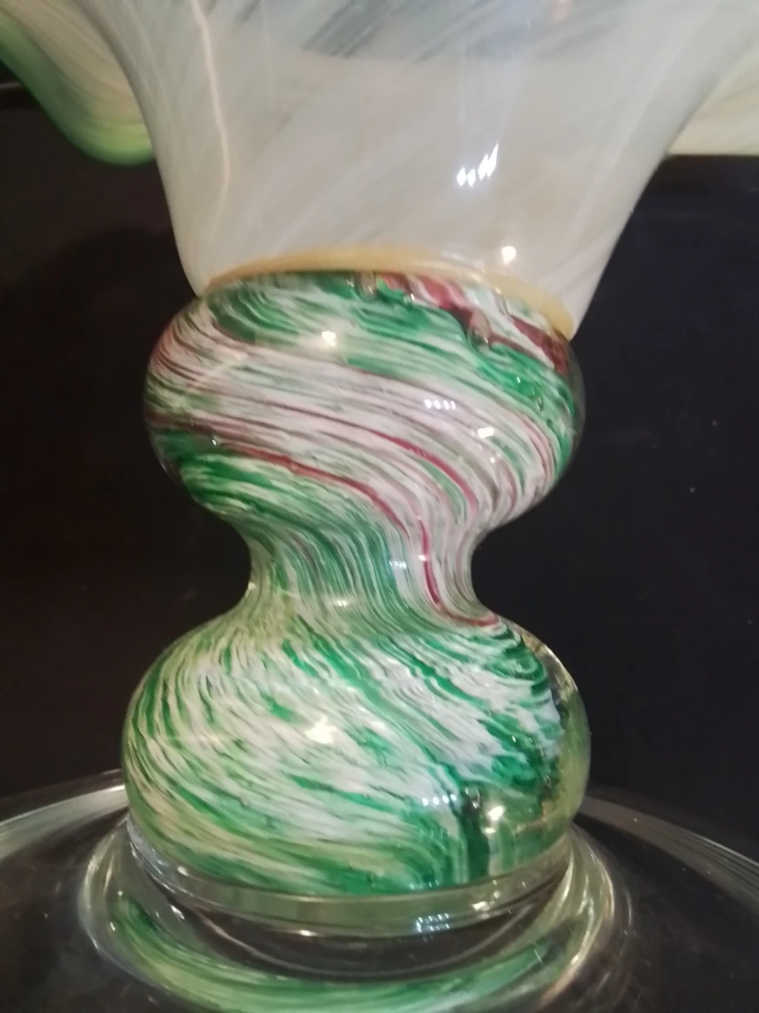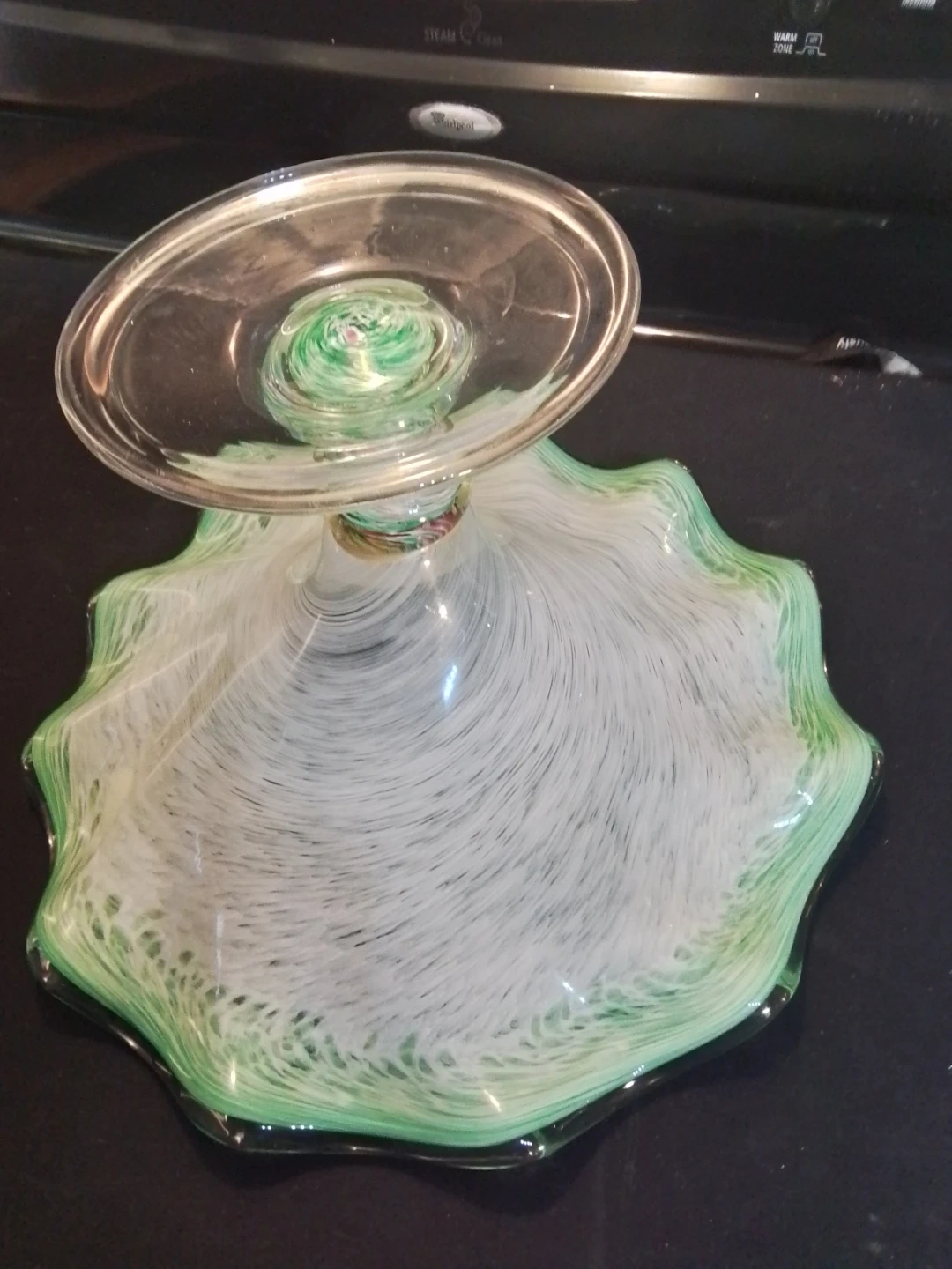 Add a touch of vintage elegance to your home with this large Murano art glass compote bowl, showcasing beautiful green and white swirls! This striking piece measures 13 inches in diameter and stands 7 inches tall, making it a substantial decorative item. While it's a used piece, its unique design and signed craftsmanship bring character to any display.