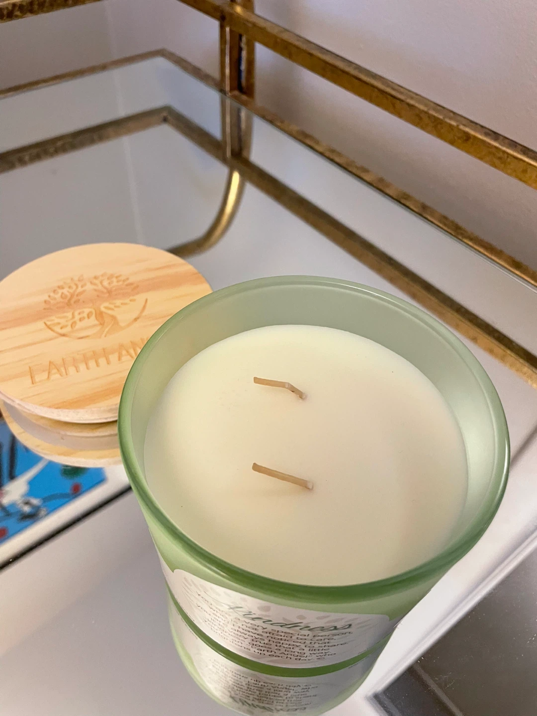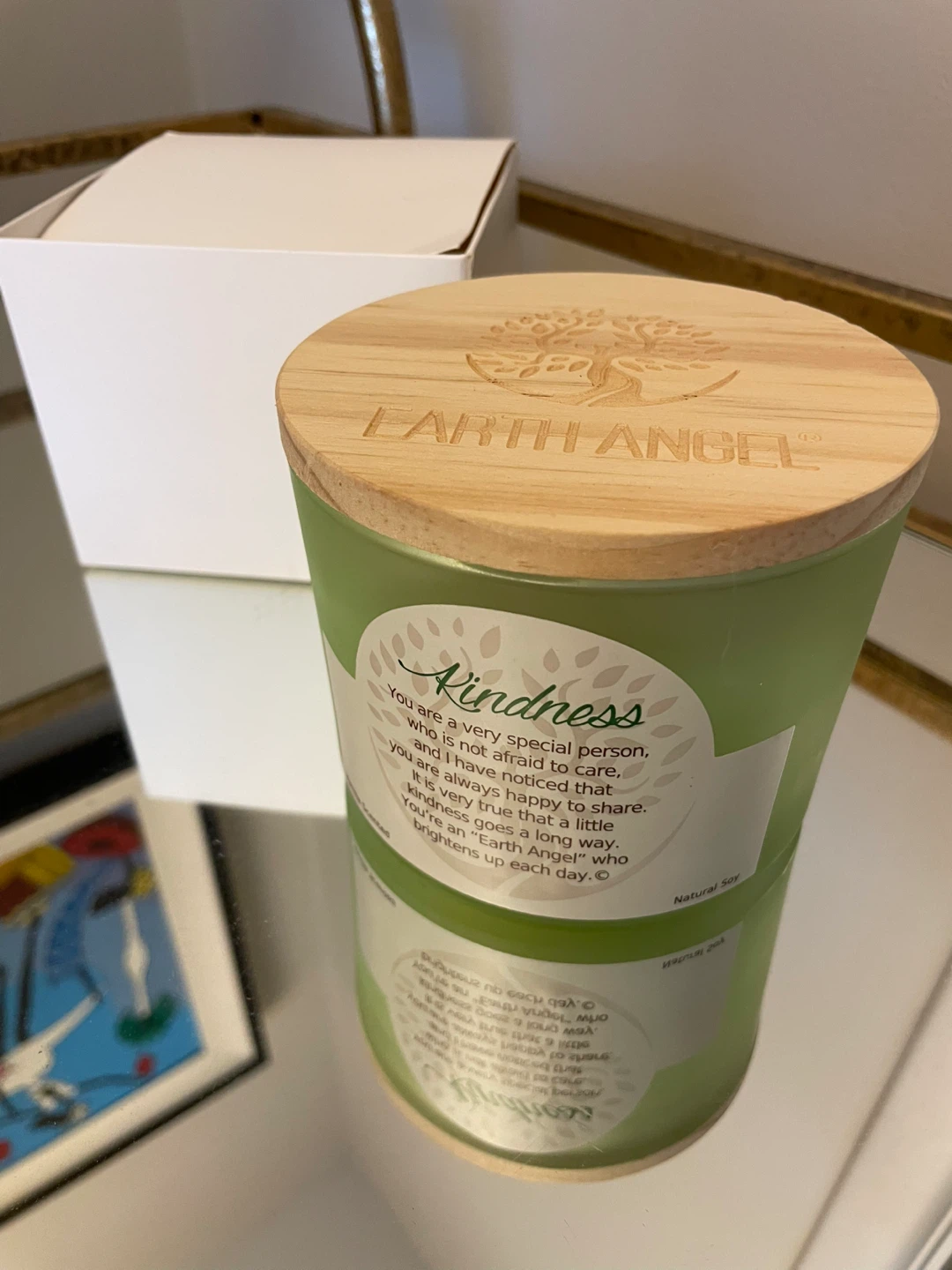 This Earth Angel candle is vanilla scented and features a wooden lid with the Earth Angel logo. The candle has a label that reads "Kindness" with a sweet message. It's a natural size and comes with its original box. The net weight is 12 oz (340.19g)