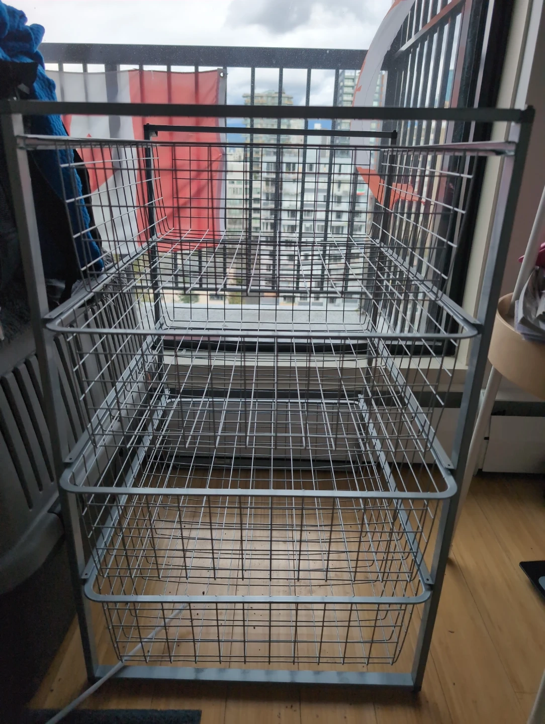 This is a 4 tier wire basket storage unit. It's made of metal with a grey finish. The baskets are spacious and perfect for organizing clothes or other household items.