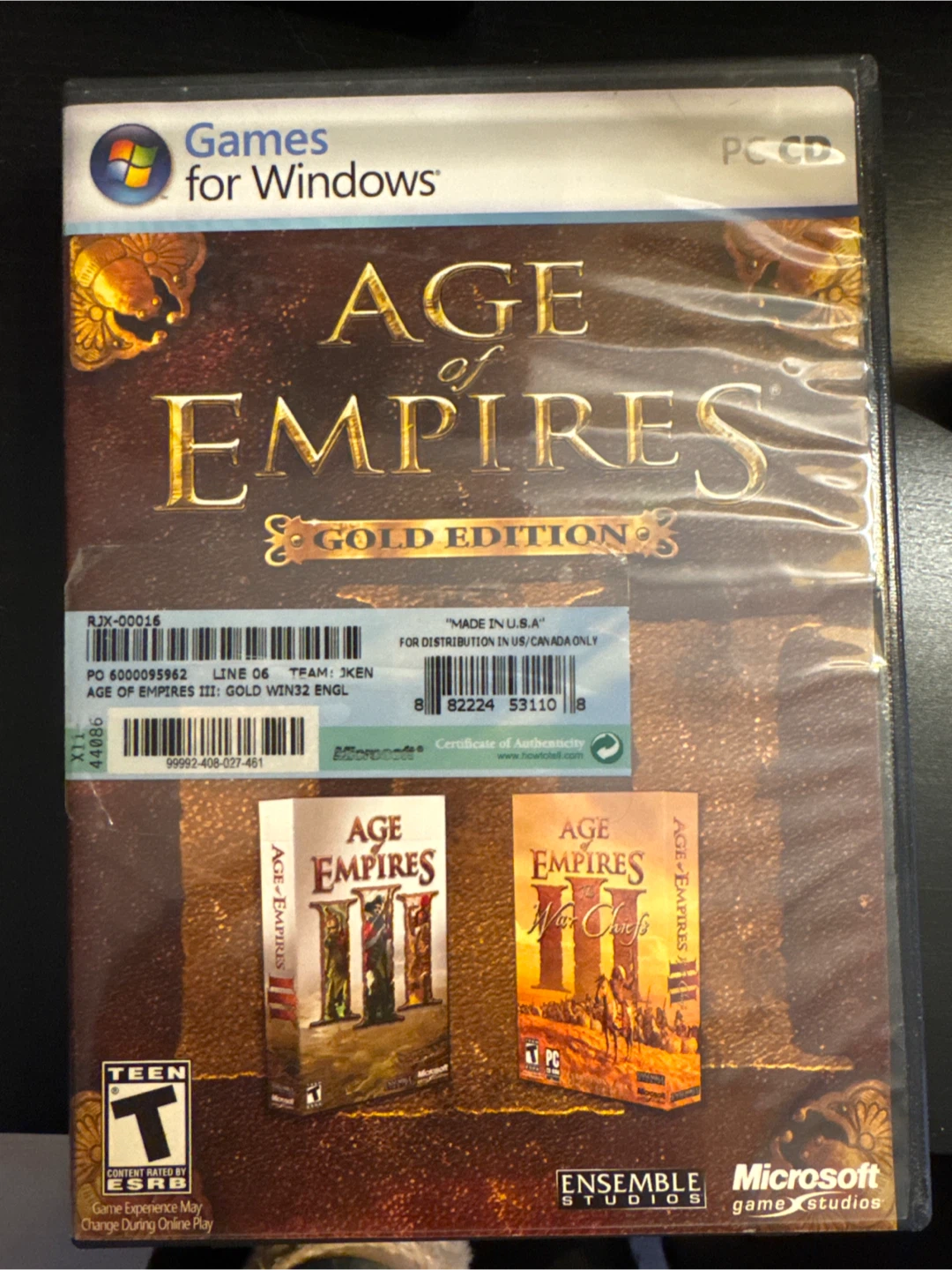Selling Age of Empires III Gold Edition for PC! This includes the original game and the War Chiefs expansion pack. Game keys included inside, and all 4 discs are in good condition.