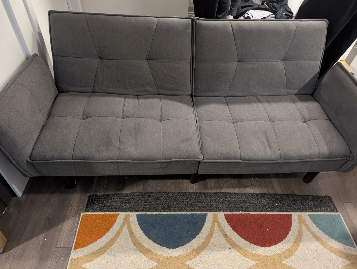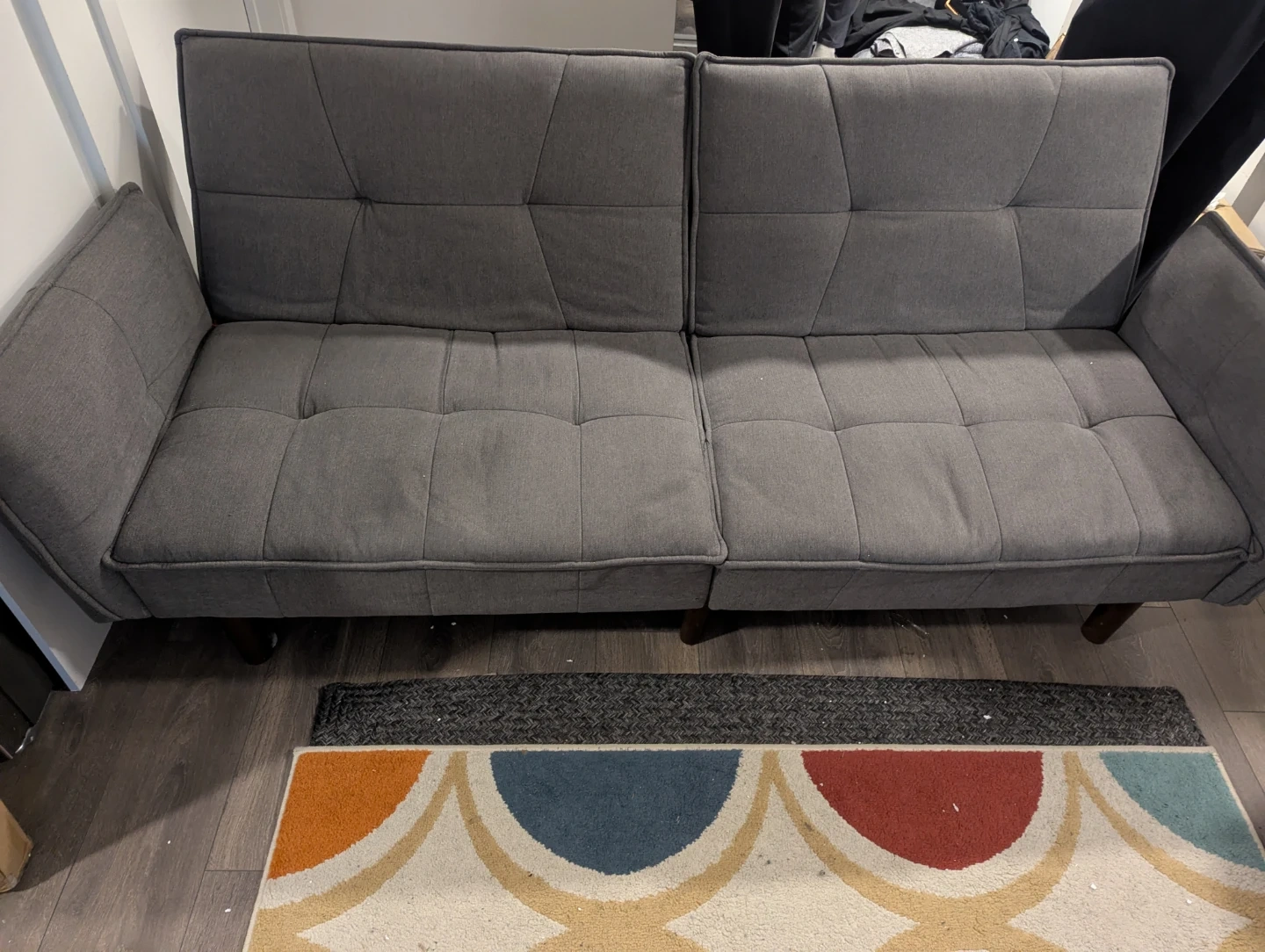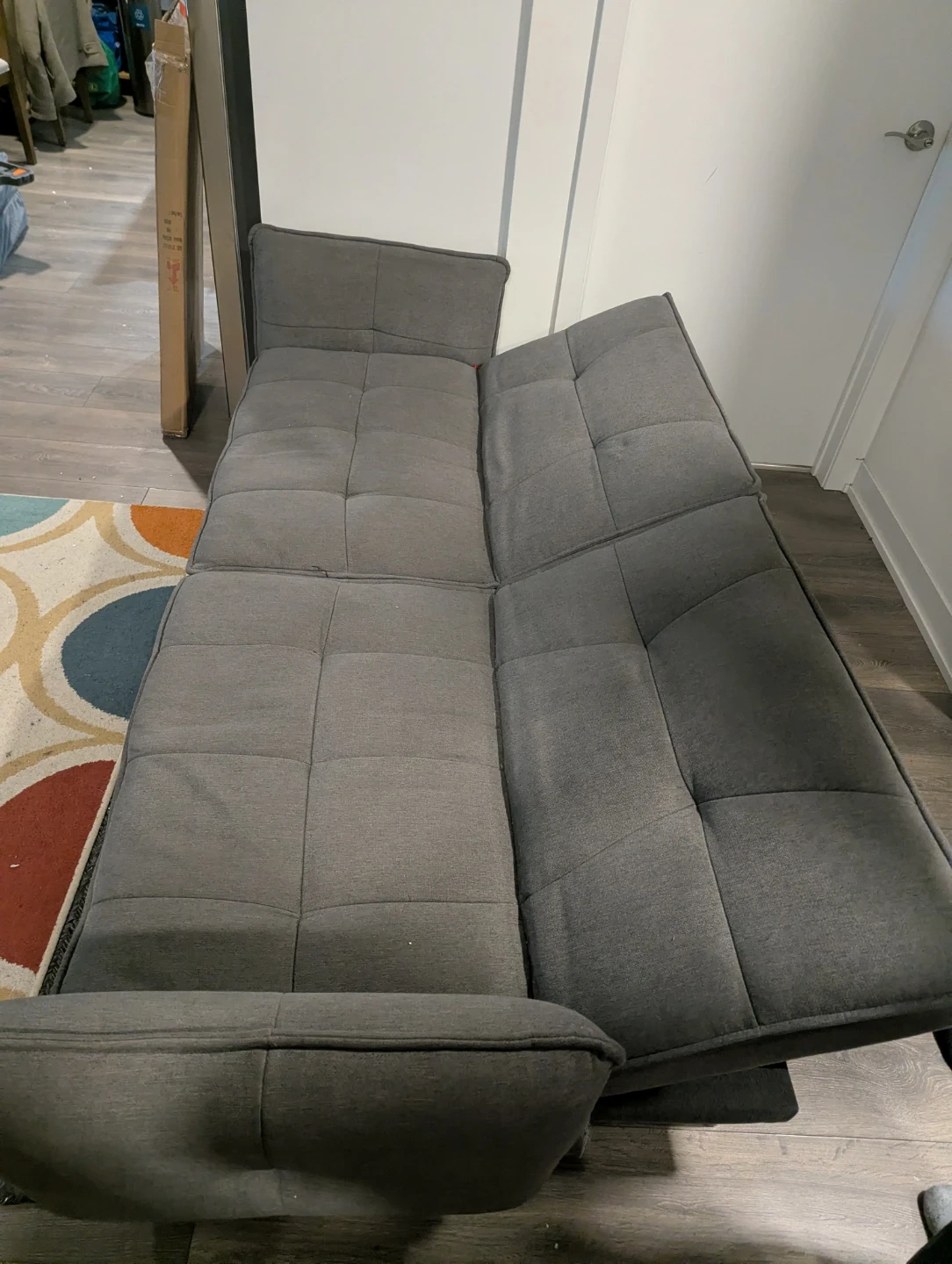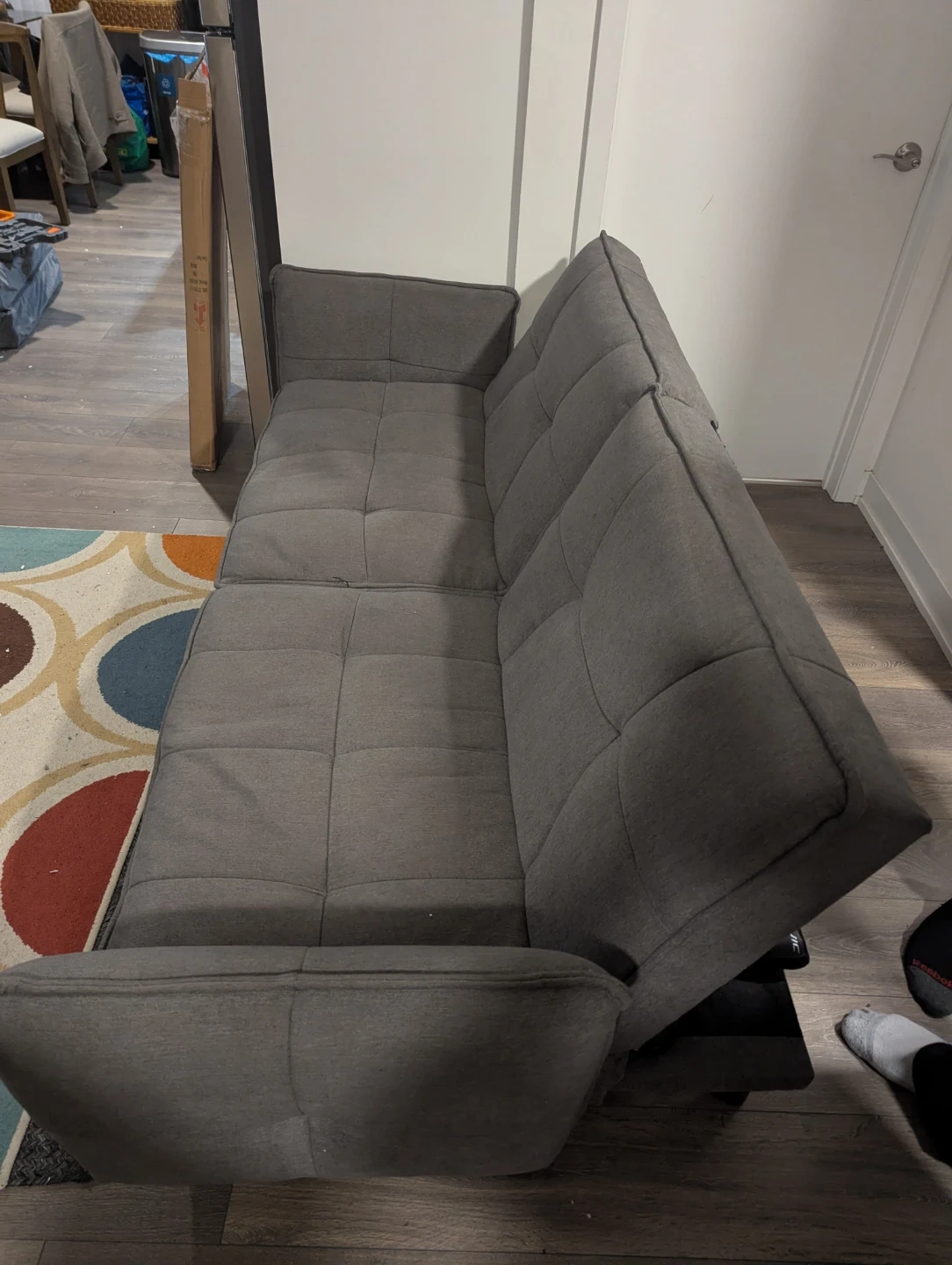 Buy & SellGrey Tufted Futon SofaGrey Tufted Futon Sofa$96This is a grey tufted futon sofa. It's upholstered in fabric and has wooden legs. It easily converts into a bed.ConditionOkayWHERE TO MEETMeet up areaView MapSELLERverifiedSamGreenbrook32727 reviews3 chats·0 favorites·57 viewsSEND CHAT TO SELLERHi Sam! I’m interested in your listing.Hi Sam! I’m interested in your listing.Get the Karrot app to chatSign In to chat