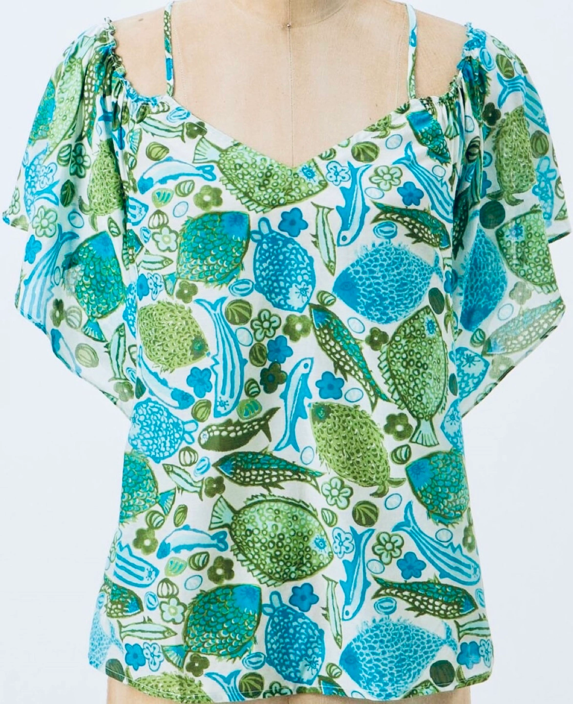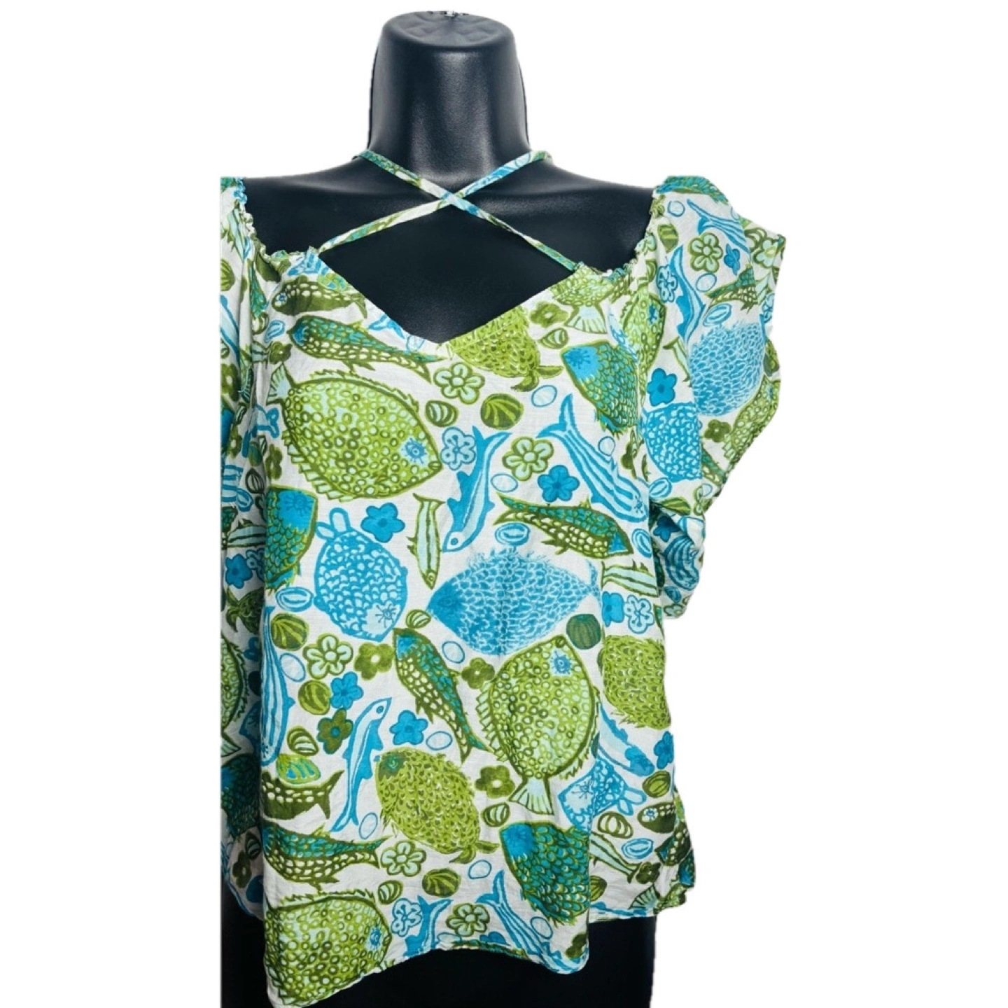 Vibrant women's top featuring a fish pattern in green and blue. Perfect for adding a splash of color to your wardrobe.