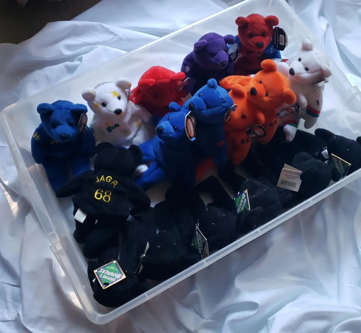 Selling a collection of BNN Bees plush toys! They come in a variety of colours including blue, orange, red, purple, white and black. Some of the bears have numbers on their jerseys. They are in great condition!