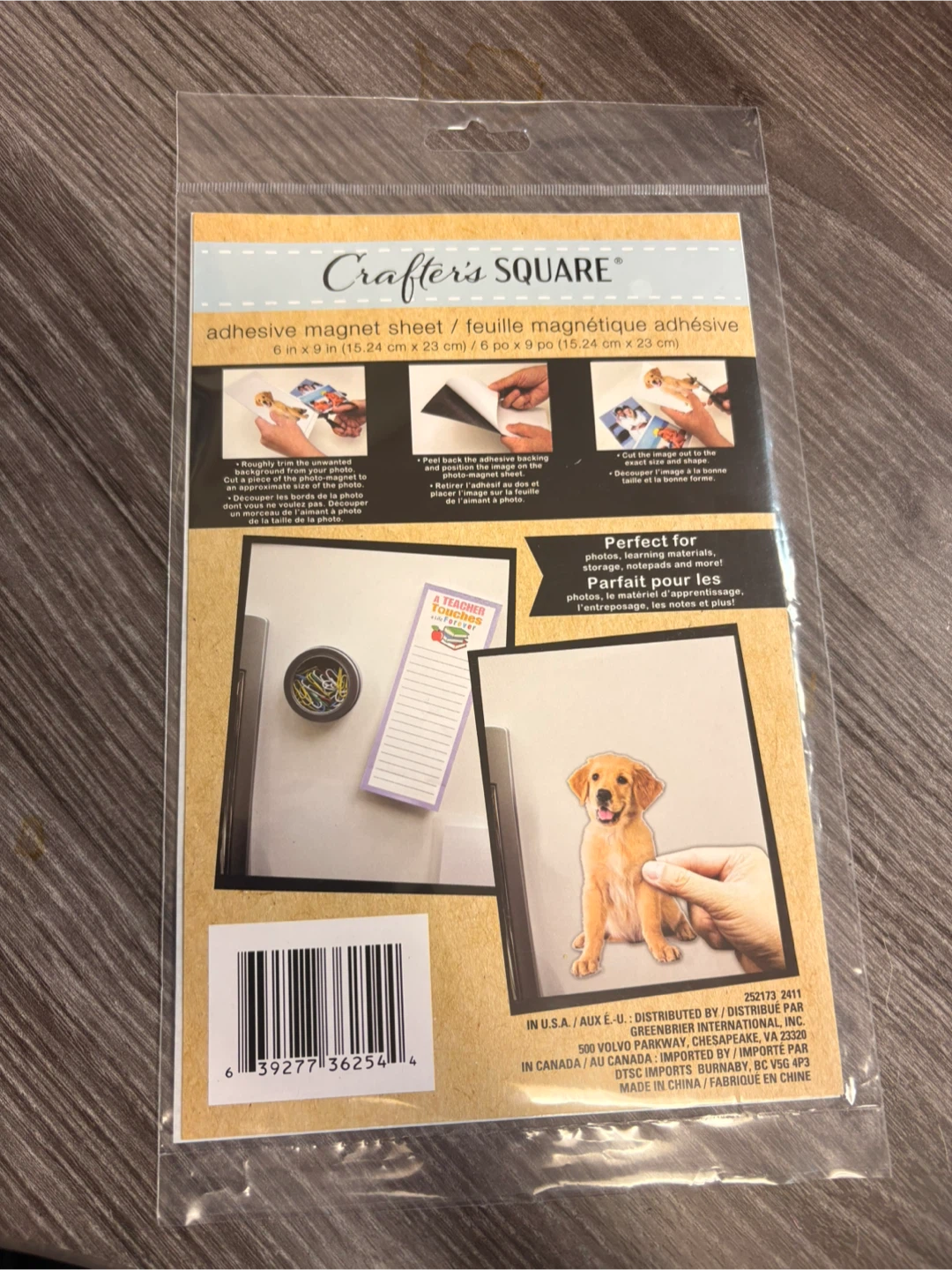 Crafter's Square adhesive magnet sheet. It's 6 inches by 9 inches. Perfect for photos, learning materials, and storage!