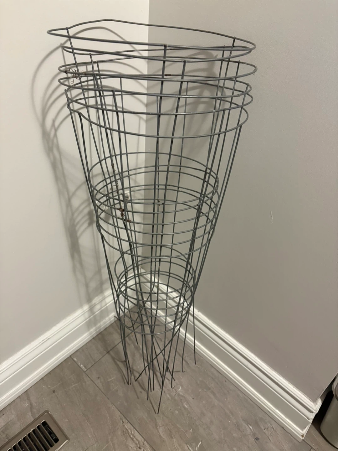 This is a wire tomato cage plant support. It's made of durable metal wire. Its conical shape provides stability for growing plants.