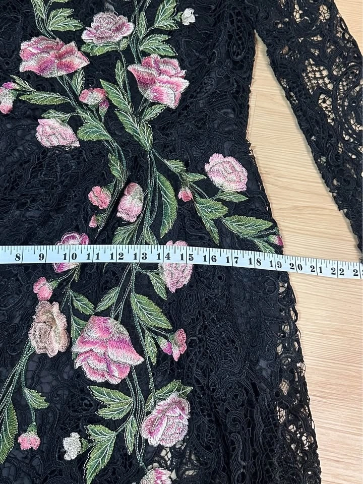 Marchesa Black Lace Floral Embroidered Long Sleeve Dress