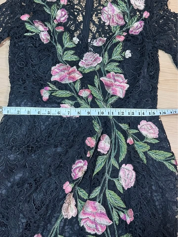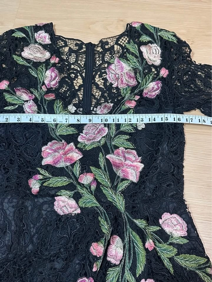 Elegant Marchesa black lace dress with intricate pink floral embroidery. Features a luxurious silk blend lining and a rayon/cotton blend outer fabric. Zipper closure on the back. Never worn, tags removed, kept in a closet for a few years. Located in Midtown Toronto.
