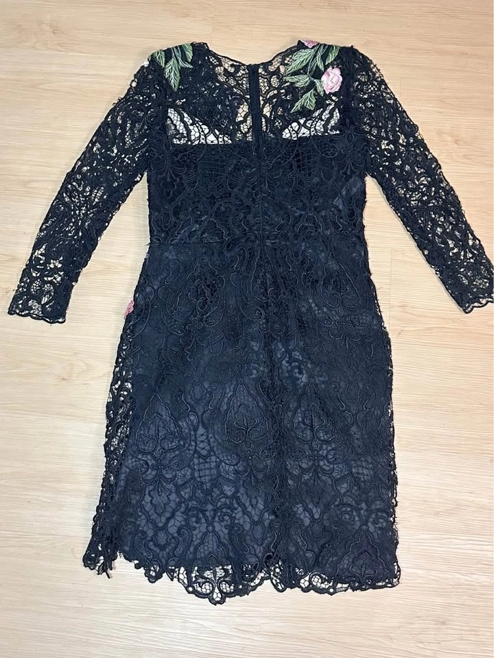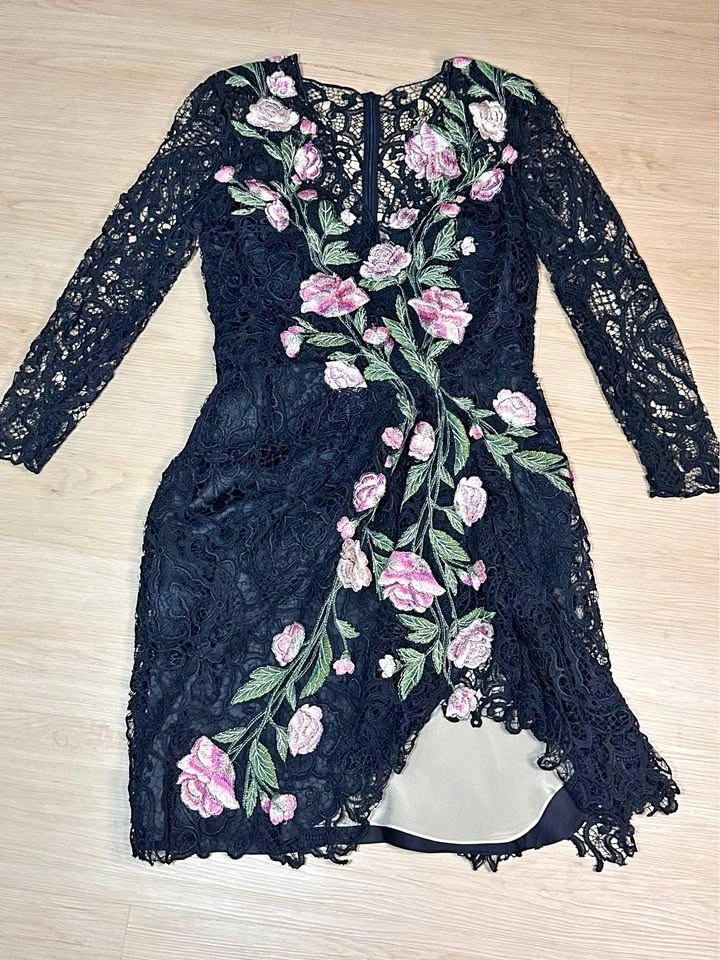 Marchesa Black Lace Floral Embroidered Long Sleeve Dress