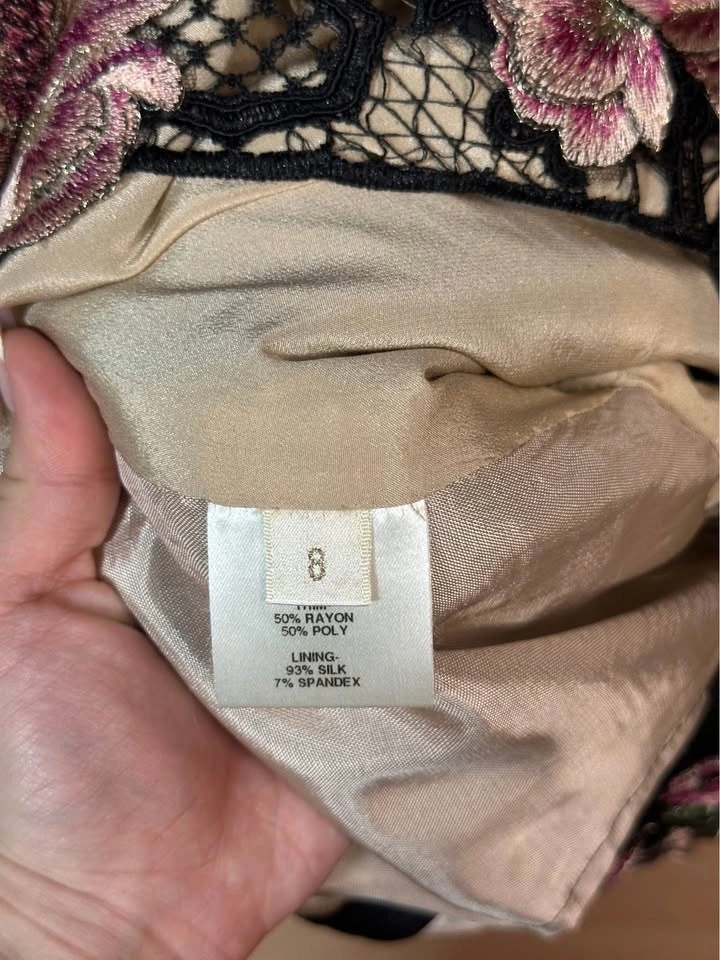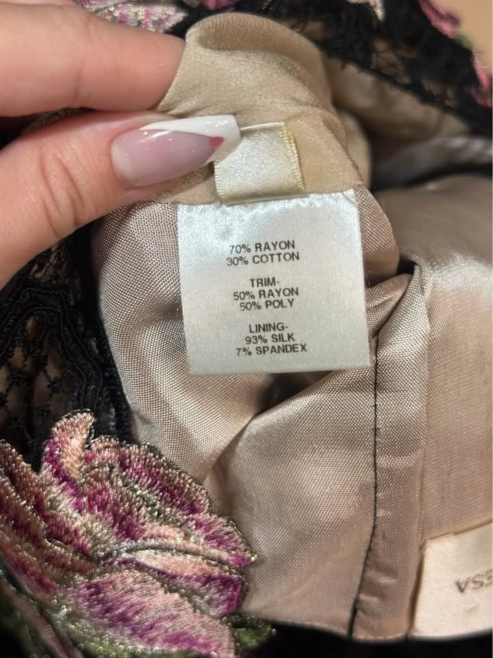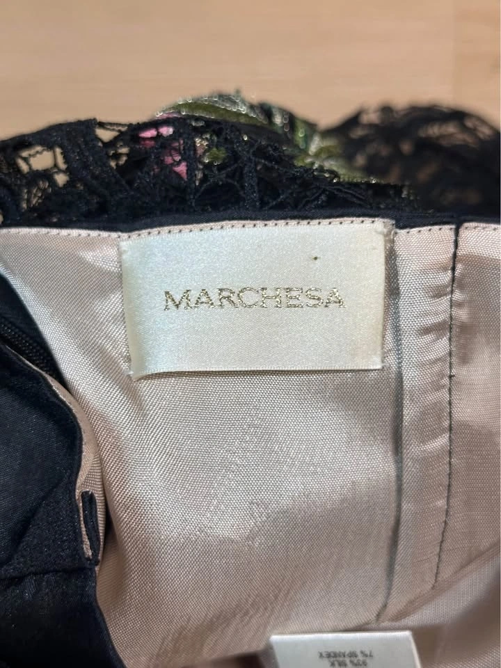 Elegant Marchesa black lace dress with intricate pink floral embroidery. Features a luxurious silk blend lining and a rayon/cotton blend outer fabric. Zipper closure on the back. Never worn, tags removed, kept in a closet for a few years. Located in Midtown Toronto.