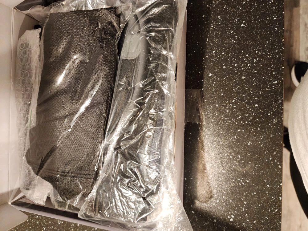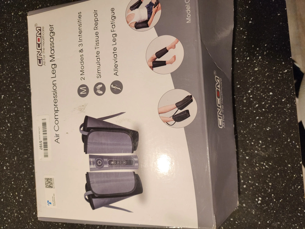 New in box. Leg massager with handheld controller. Two modes and three intensities. Alleviates leg fatigue. Includes leg cuffs and power adapter.