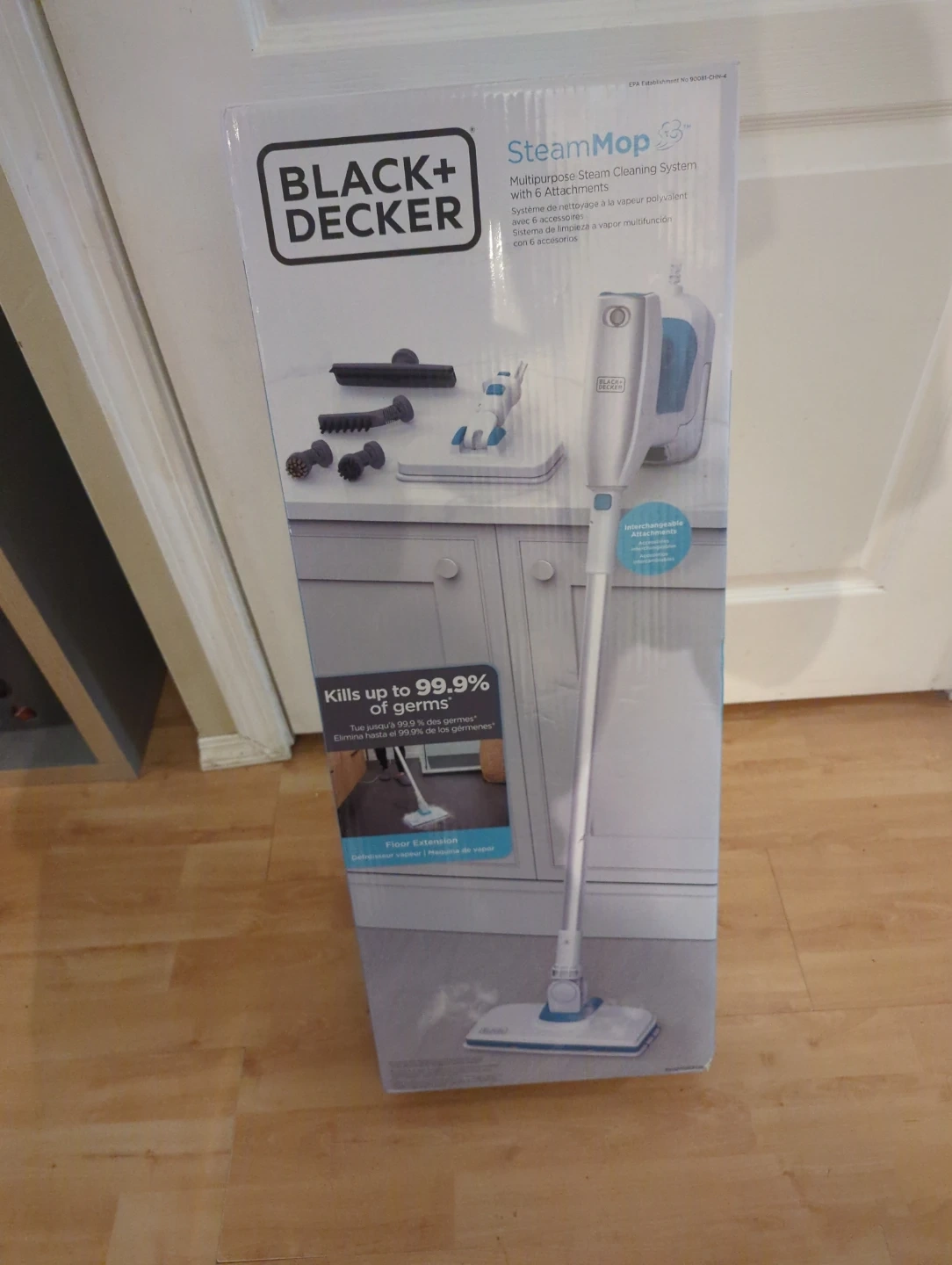 Multipurpose steam cleaning system from Black+Decker. It kills up to 99.9% of germs. Includes a floor extension and interchangeable attachments. New never opened.
