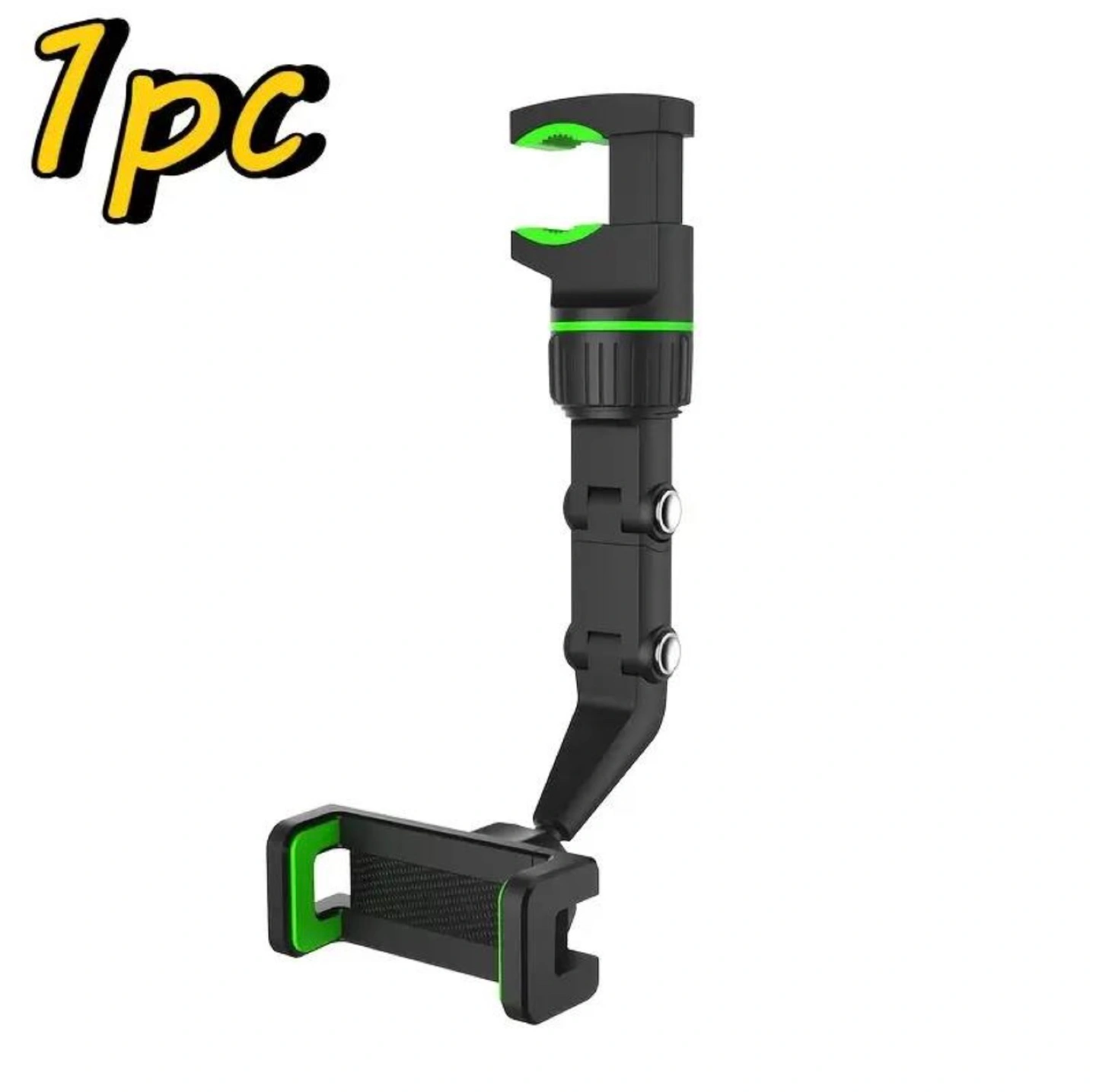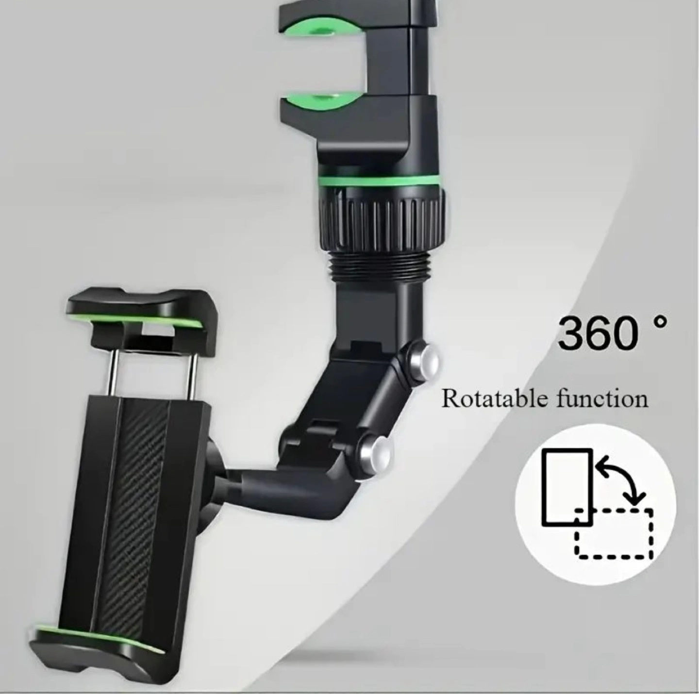 Versatile phone holder, easily adjustable. Attaches to various surfaces. 360° rotation. Black with green accents.