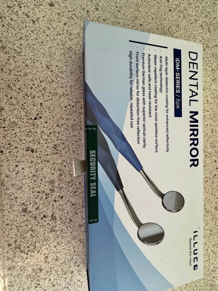 Professional dental mirror set with anti-fog technology and water-repellent coating. Provides distortion-free reflection. Mirrors are autoclave-safe and heat-resistant for high durability. Box contains 5 mirrors from IDM-Series. Primary colors are blue and silver. I have 1 pack available. Originally $85.00.