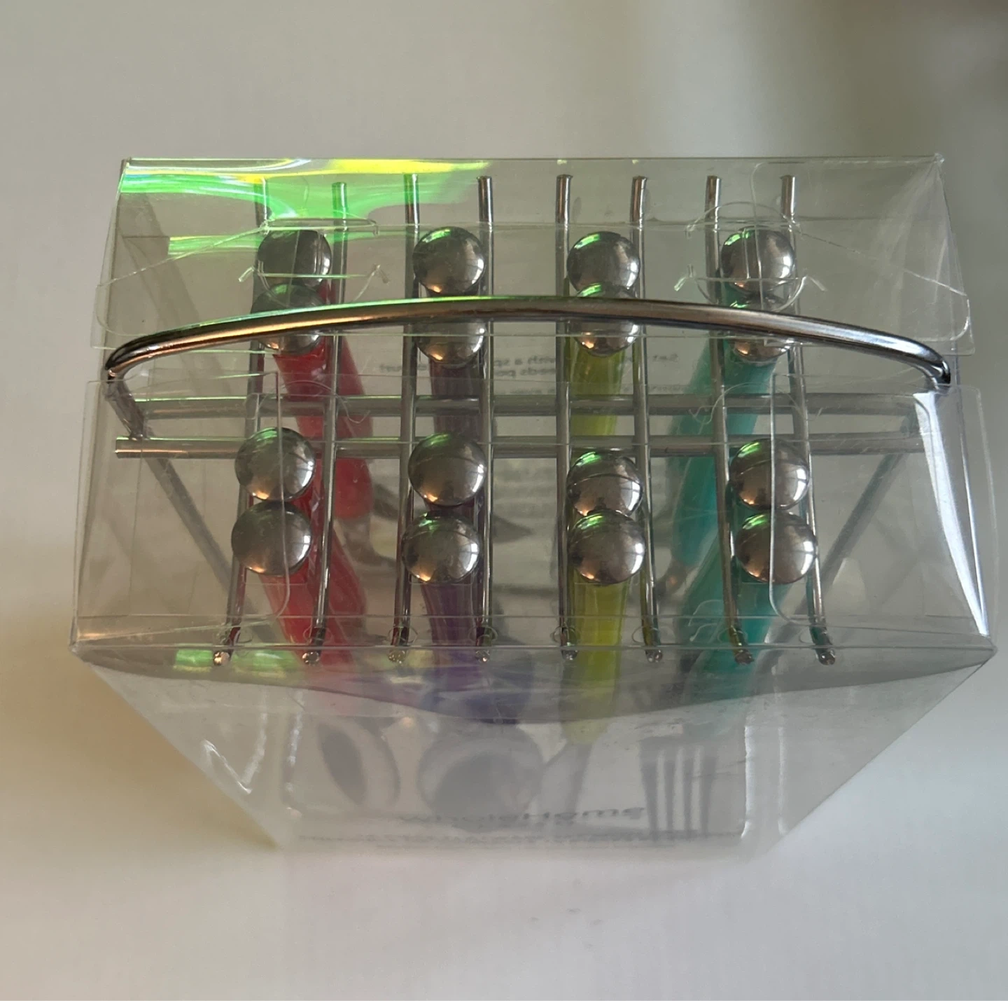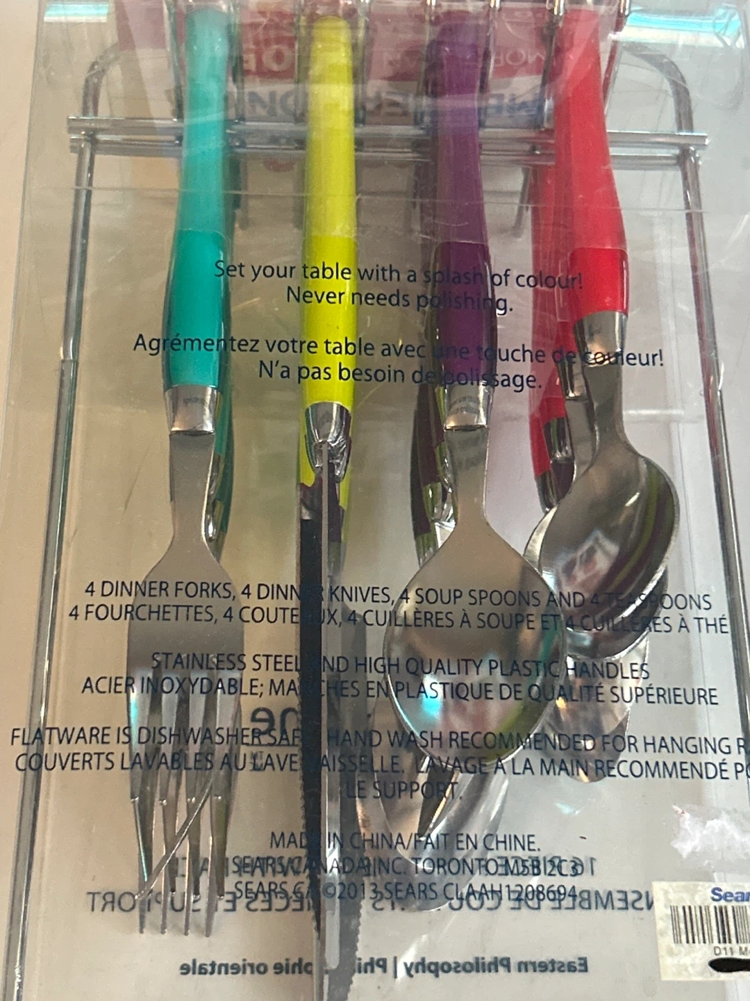 It features stainless steel and high-quality plastic handles. The flatware is dishwasher safe and the rack is recommended for hanging. Set your table with a splash of colour!