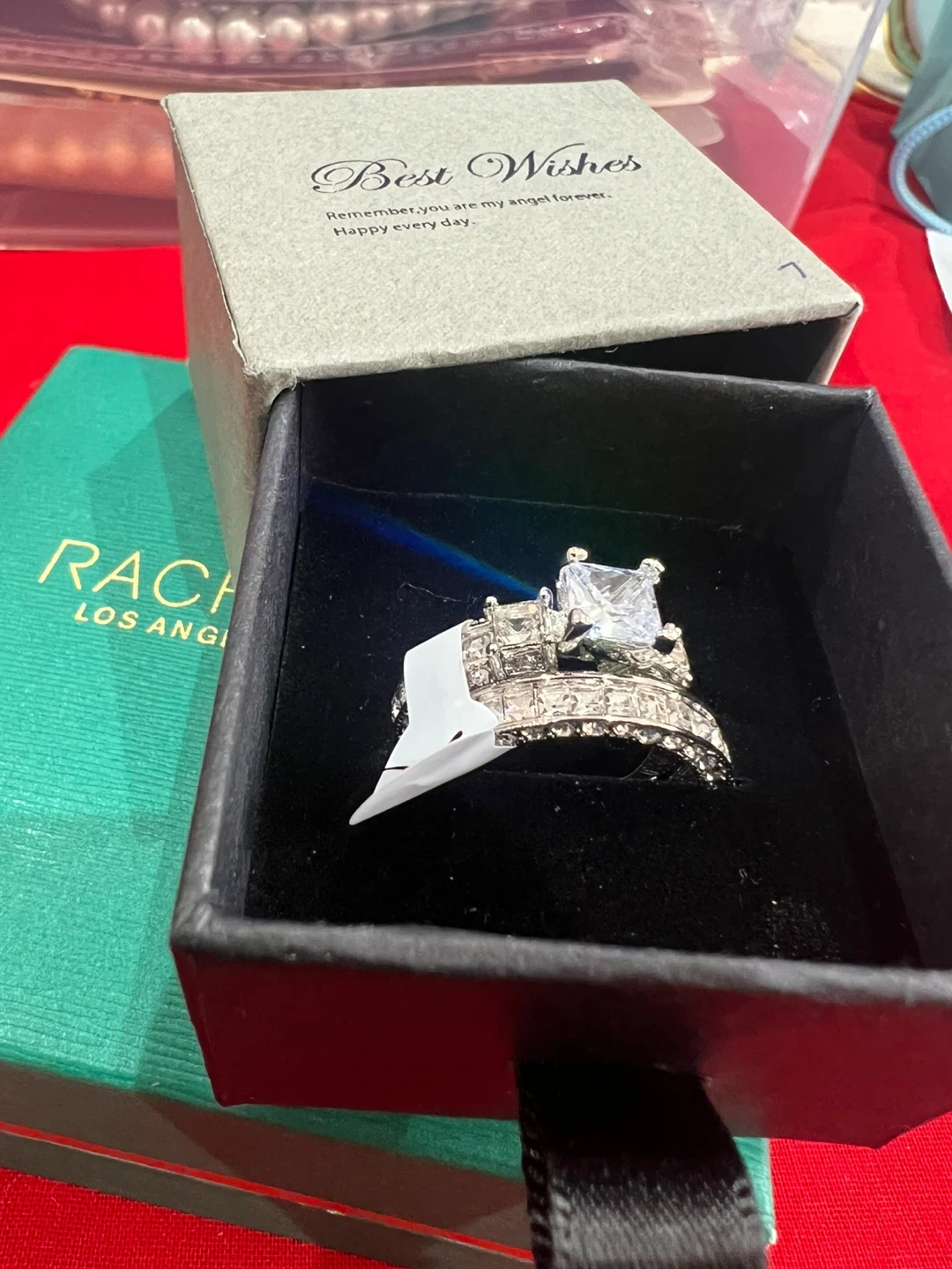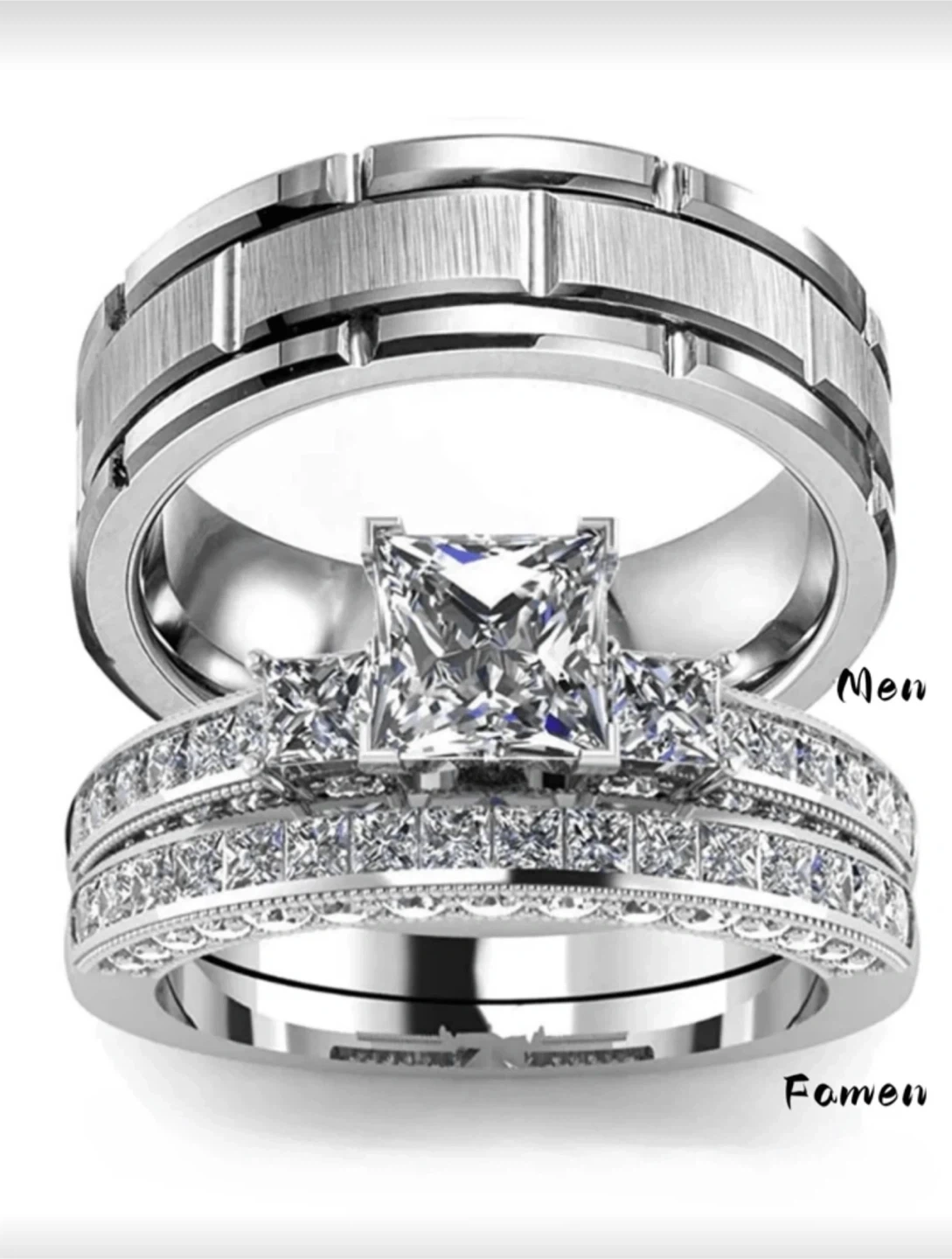This wedding ring set includes a men's tungsten carbide band and a women's three-piece bridal set with princess-cut and pave stones. The men's ring is stainless steel with a brushed and polished finish. The women's rings are silver-toned with clear stones, designed to be worn together.
