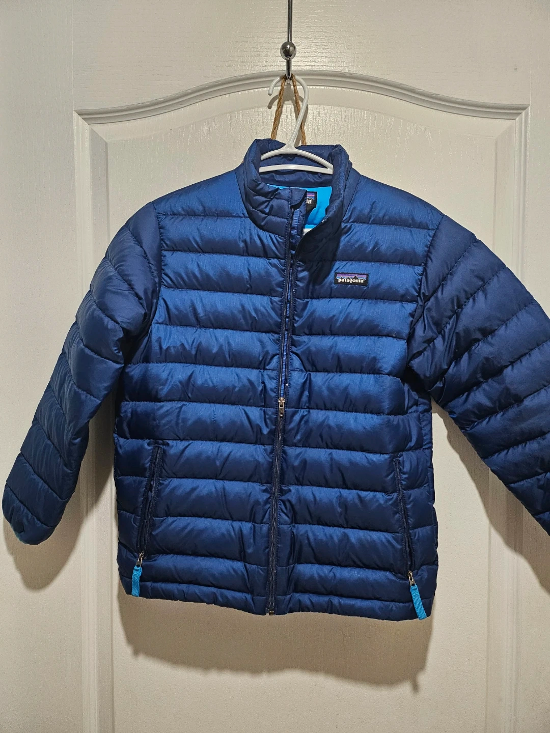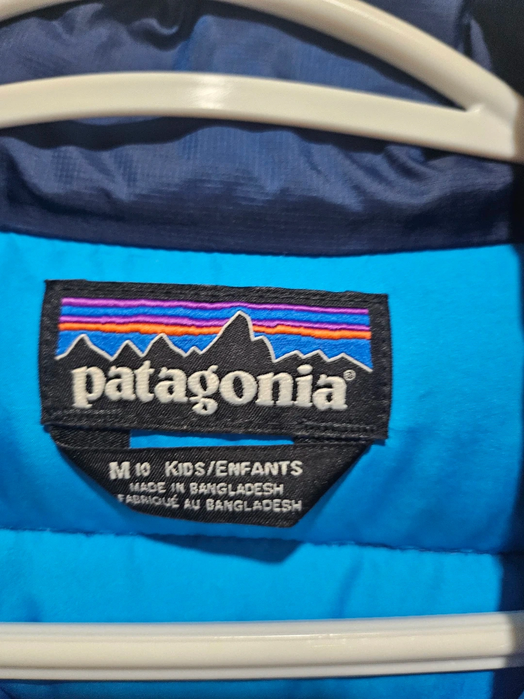 This is a kids' puffer jacket from Patagonia in blue. It's a size medium, equivalent to a kids' size 10. Made in Bangladesh. Perfect for staying warm on cooler days!