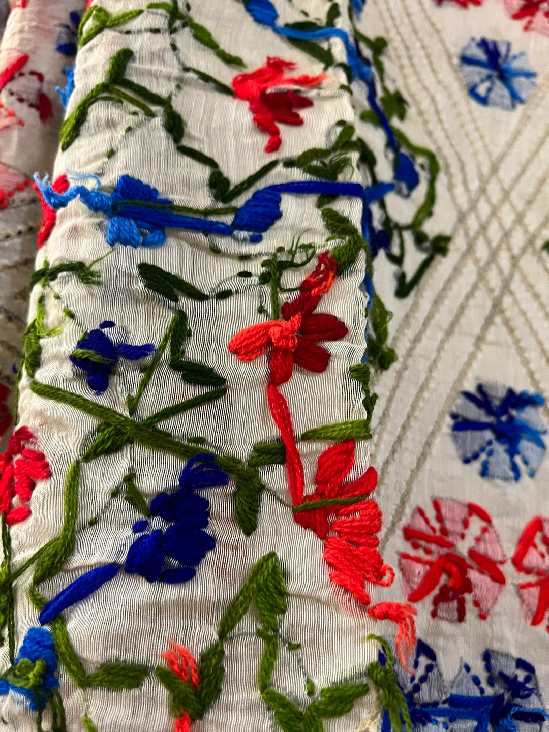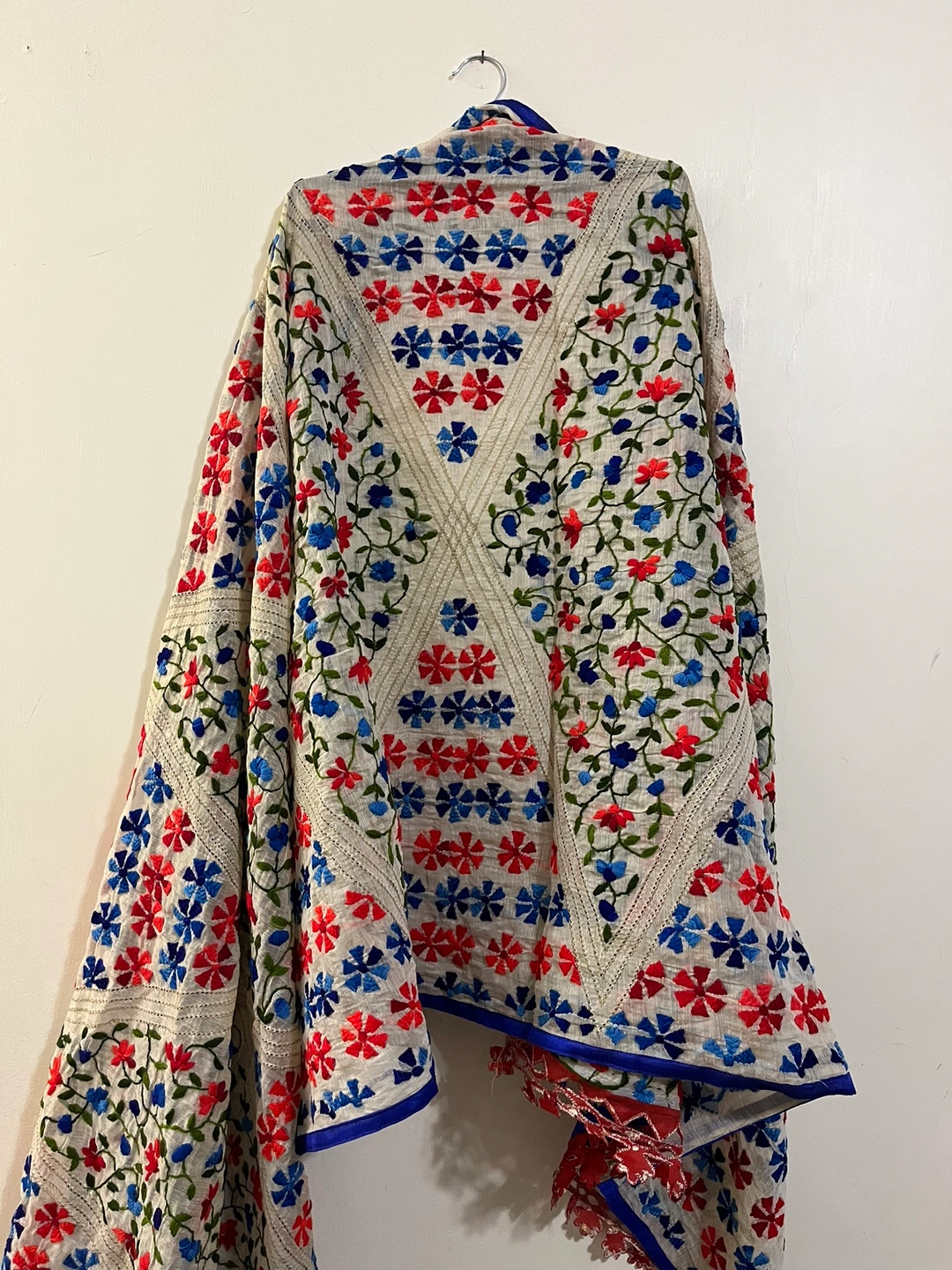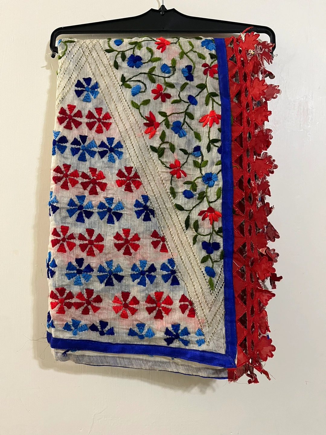 This beautiful scarf features intricate embroidery in shades of red, blue, and green on a cream background. It has a blue and red border around the edges.