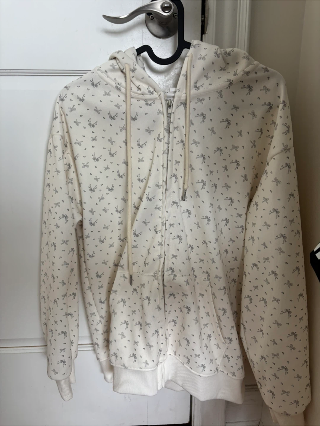 Creamy white hooded zip-up sweatshirt. It features a subtle all-over grey bow pattern. Ribbed cuffs and hem for a comfy fit.
