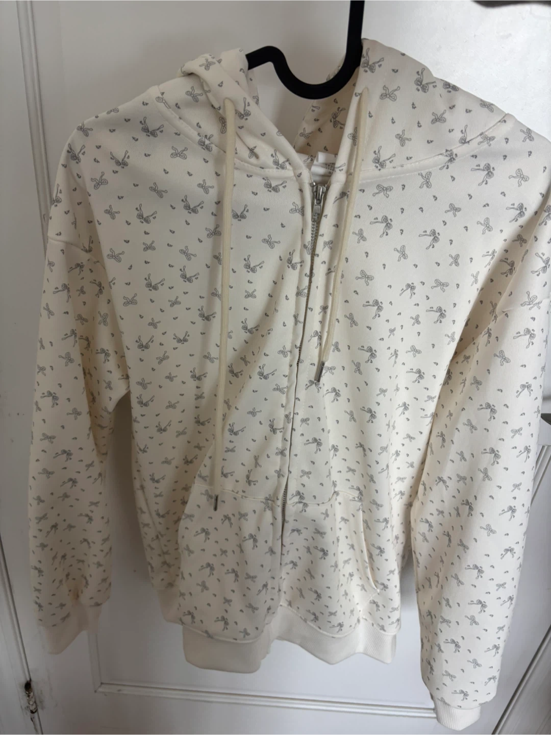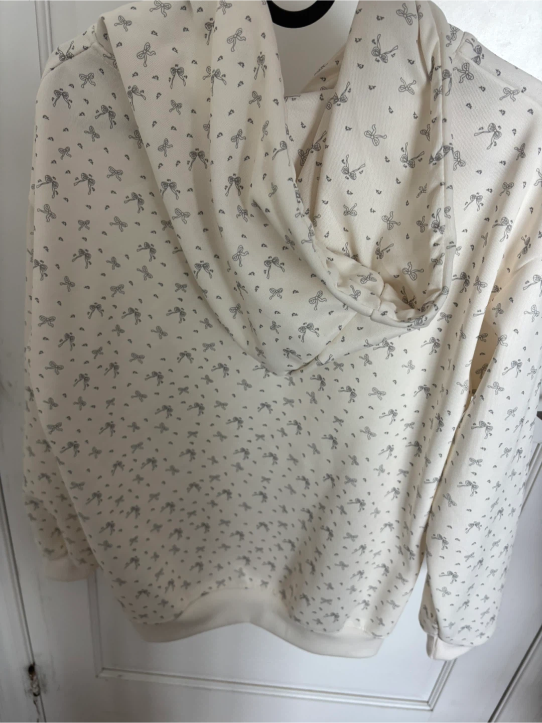 Creamy white hooded zip-up sweatshirt. It features a subtle all-over grey bow pattern. Ribbed cuffs and hem for a comfy fit.