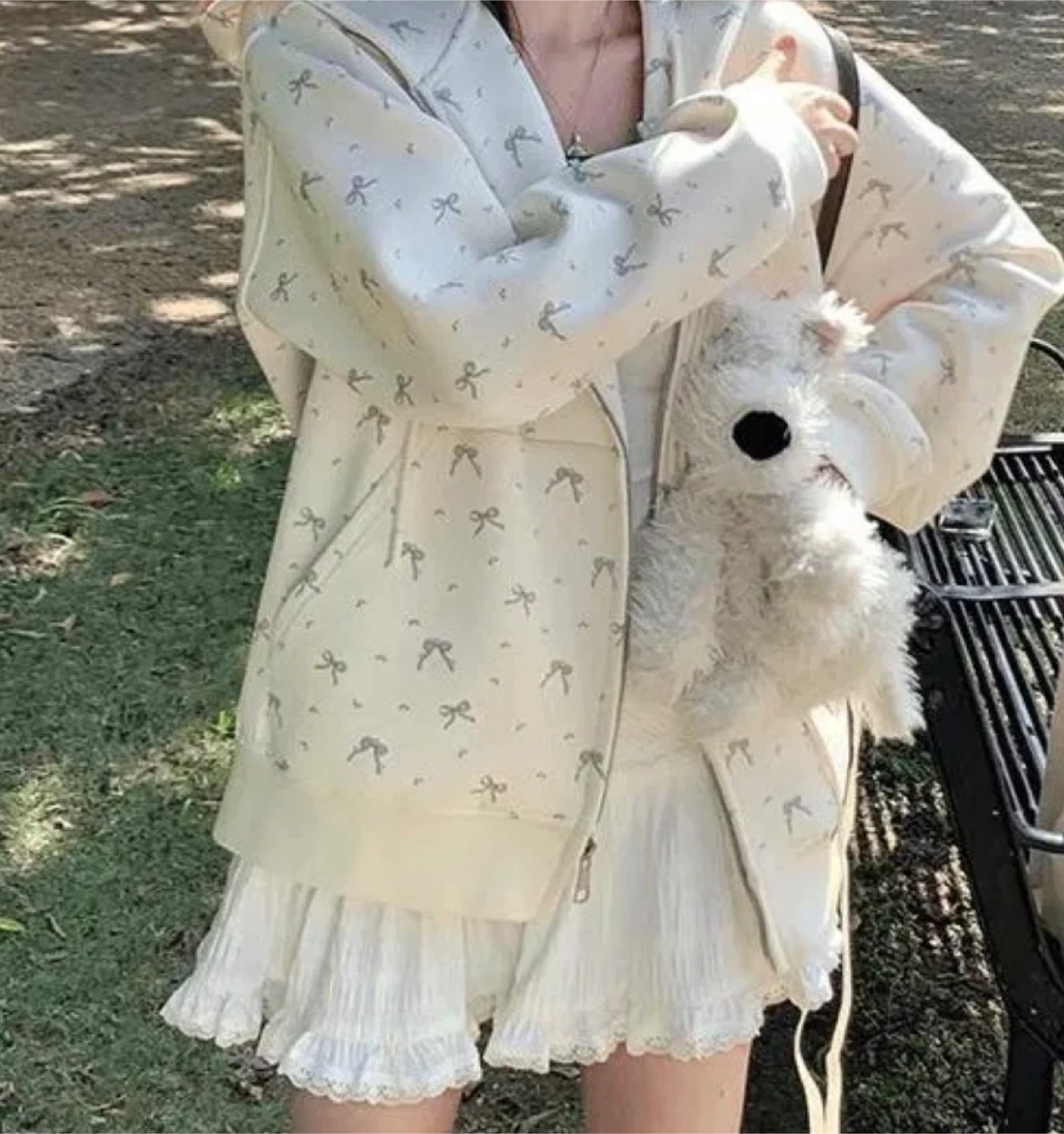 White Hooded Zip-Up Sweatshirt with Bow / Ribbon Pattern