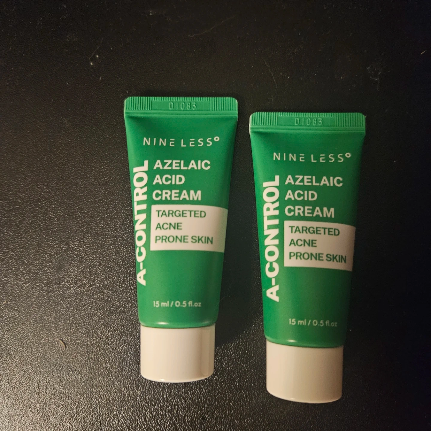 Two tubes of Nine Less A-Control Azelaic Acid Cream. Each tube contains 15 ml / 0.5 fl.oz. It's formulated for targeted acne and prone skin. One of them is sealed and the other has been used once.