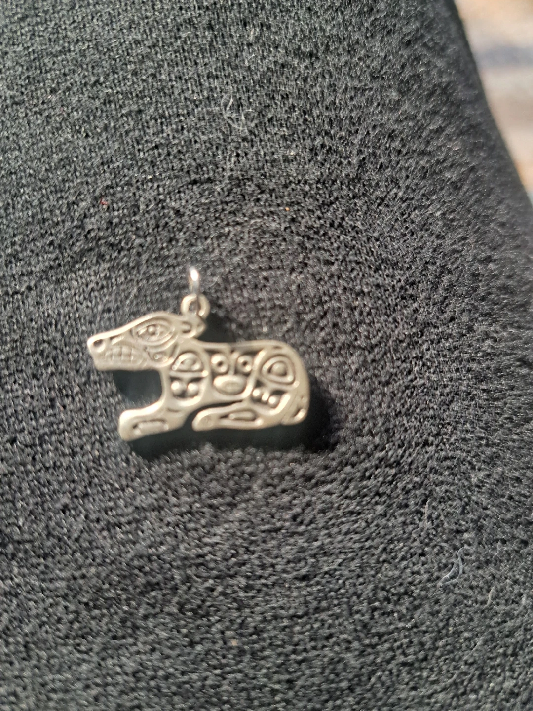 A silver-tone bear charm pendant with Indigenous-inspired carvings. It's engraved with 'R. DICK CANADA'. This unique charm is perfect for adding to a bracelet or necklace.