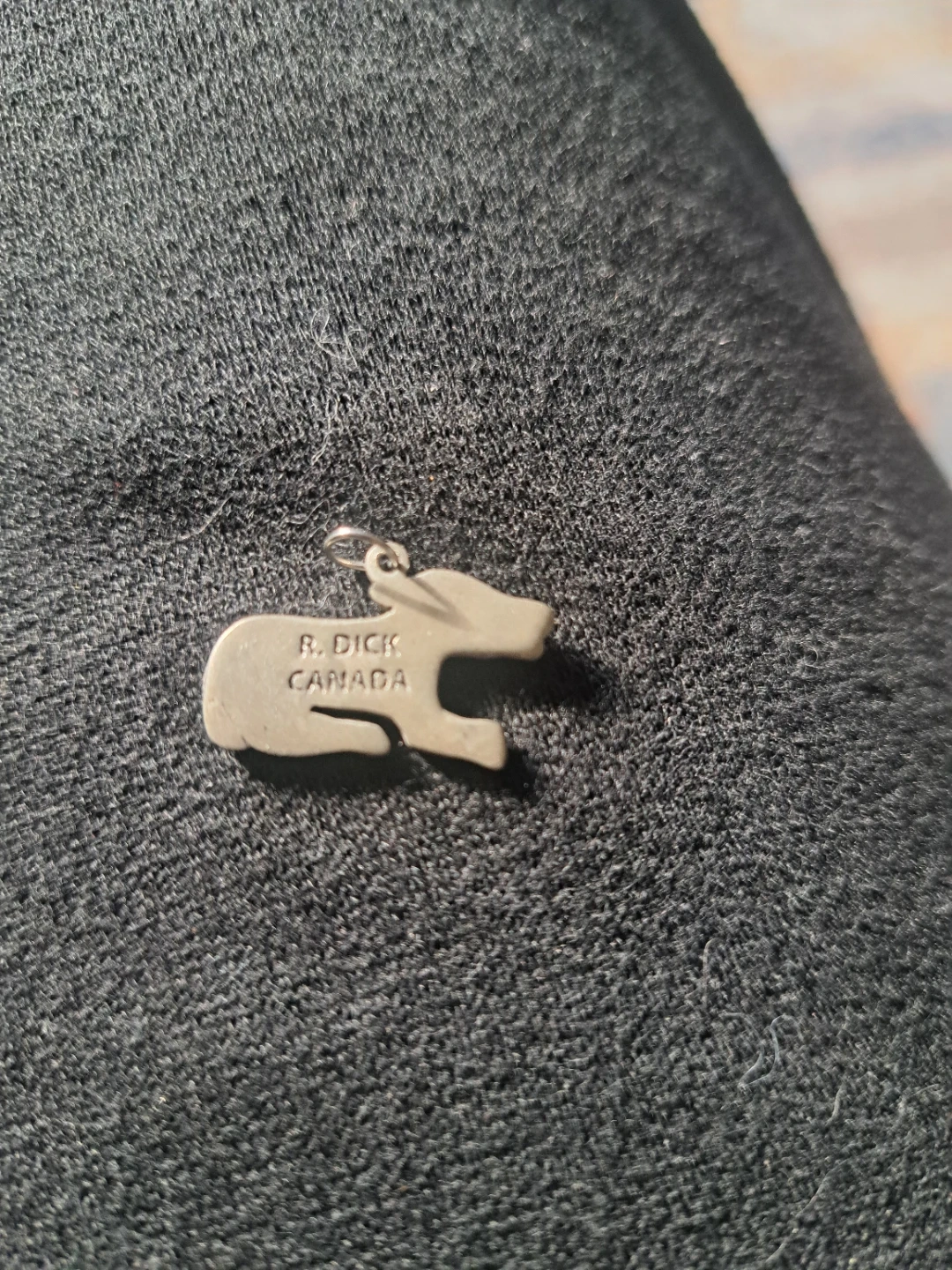 A silver-tone bear charm pendant with Indigenous-inspired carvings. It's engraved with 'R. DICK CANADA'. This unique charm is perfect for adding to a bracelet or necklace.