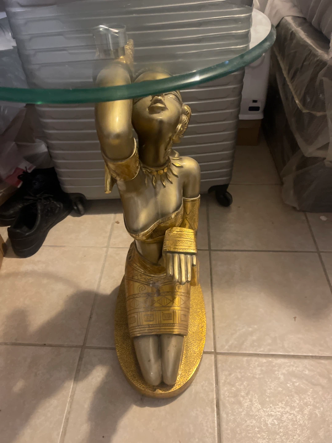 $70 dollars each, (2) This is a unique side table featuring a gold-colored statue as the base and a glass top. It's a great conversation piece and adds a touch of elegance to any room!