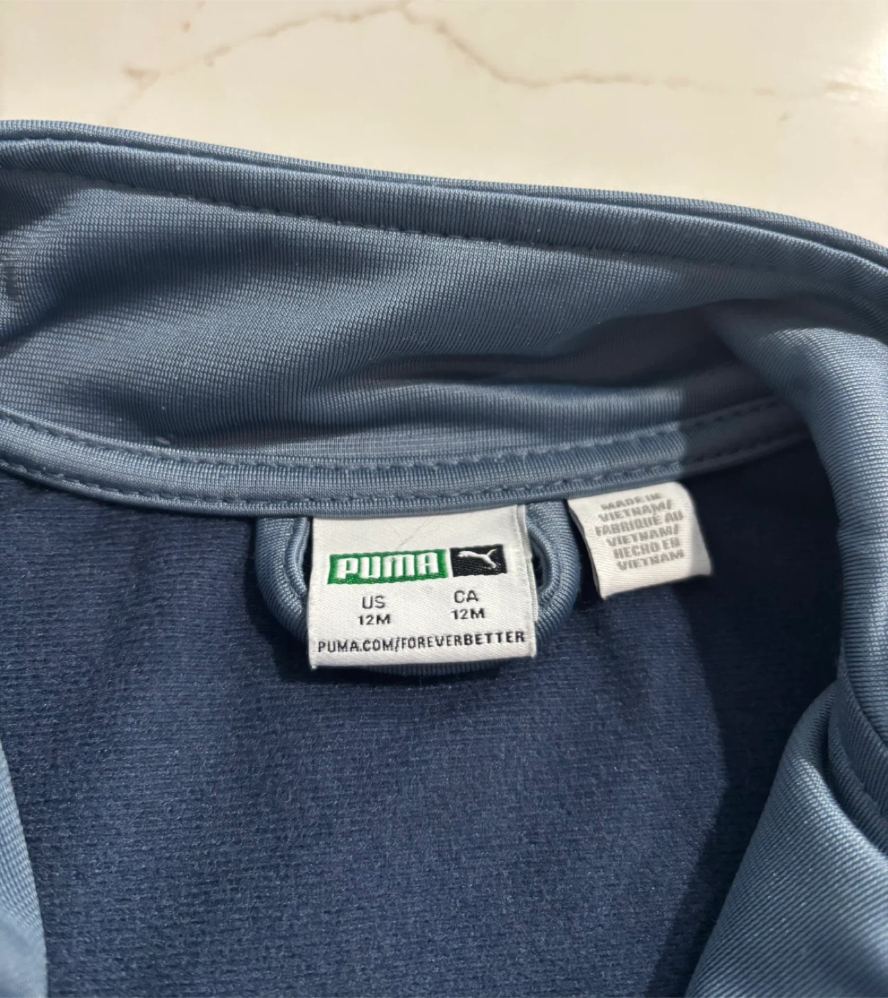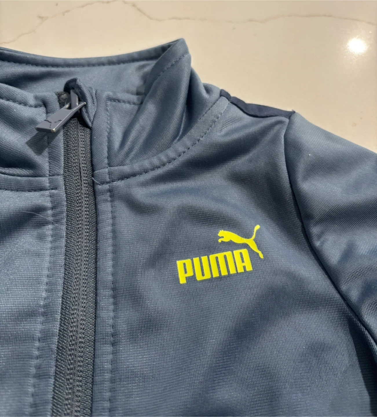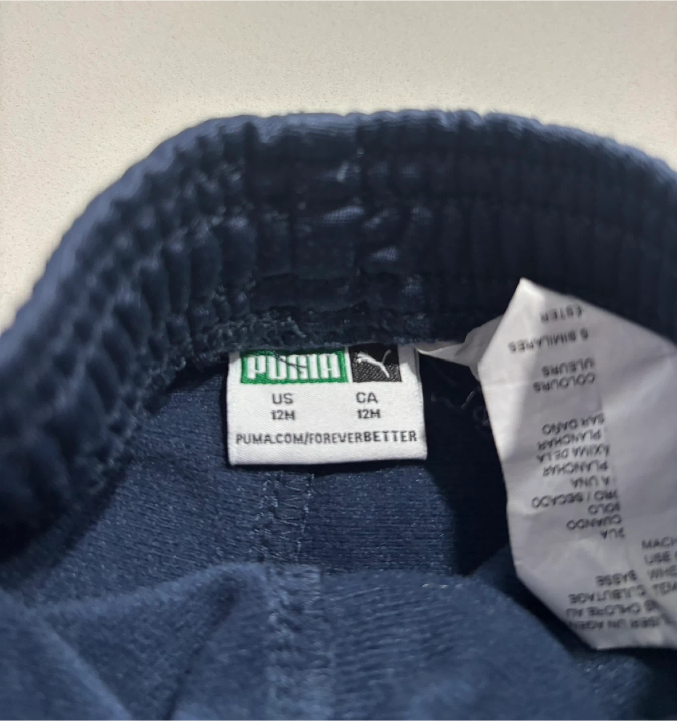 This is a two-piece Puma tracksuit set for babies. It includes a full-zip jacket and matching pants. The set is size 12 months and features the Puma logo. Excellent Used Condition 6