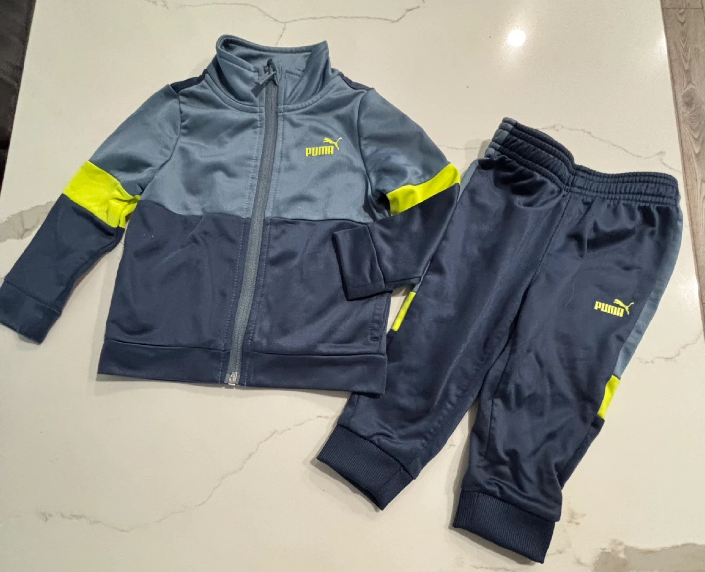 This is a two-piece Puma tracksuit set for babies. It includes a full-zip jacket and matching pants. The set is size 12 months and features the Puma logo. Excellent Used Condition 6