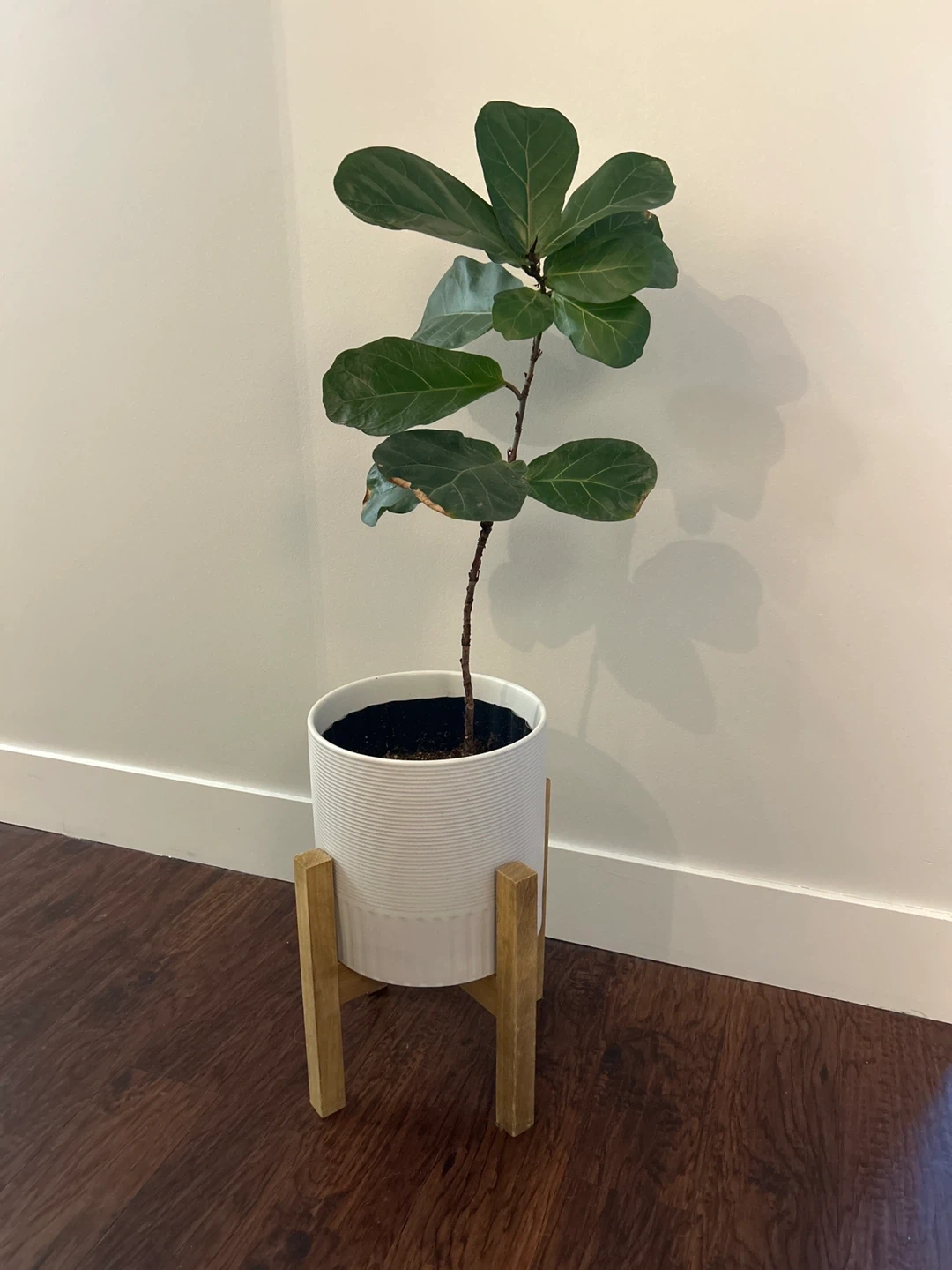 Fiddle Leaf Fig Plant in White Pot with Wooden Stand