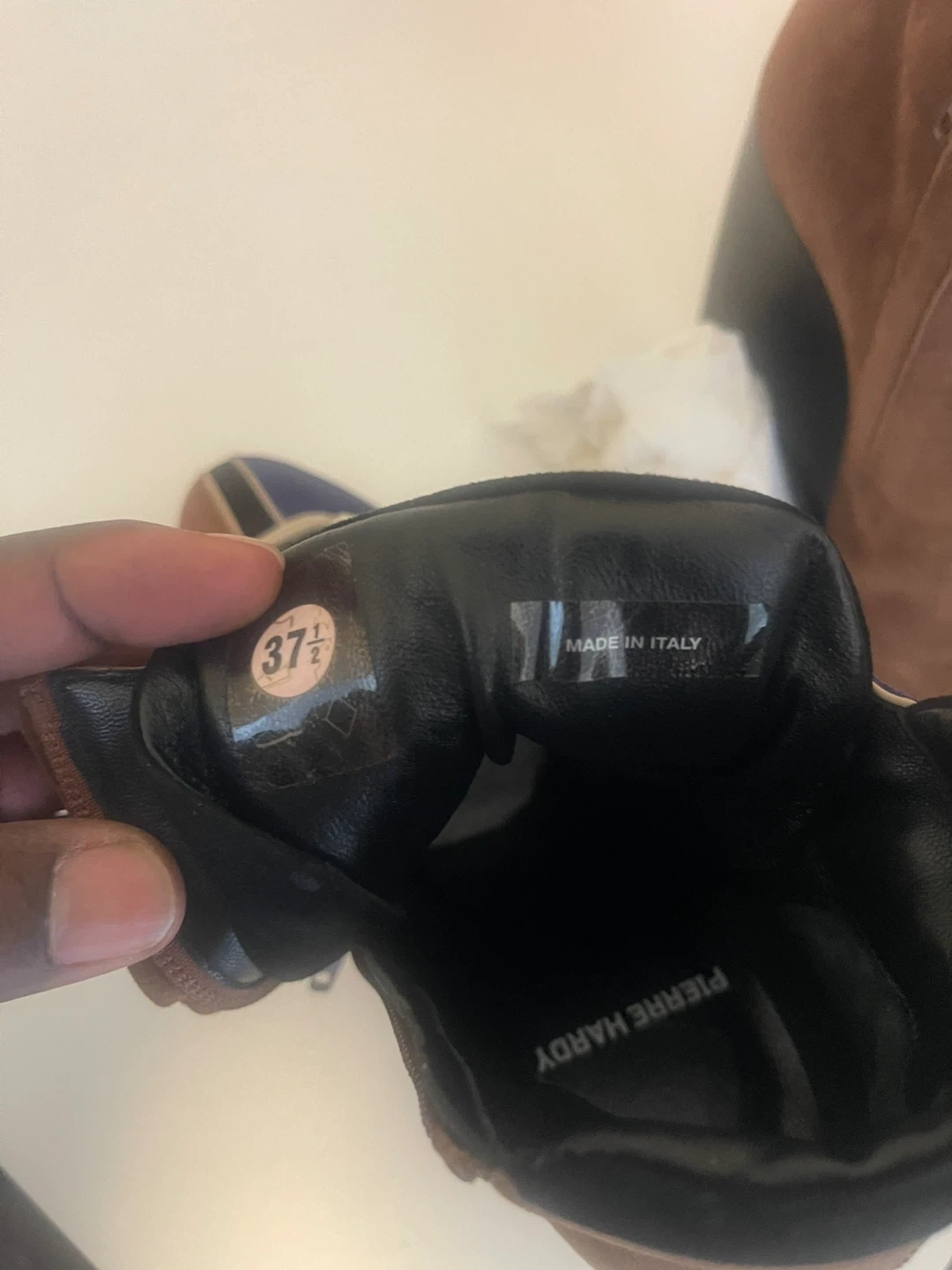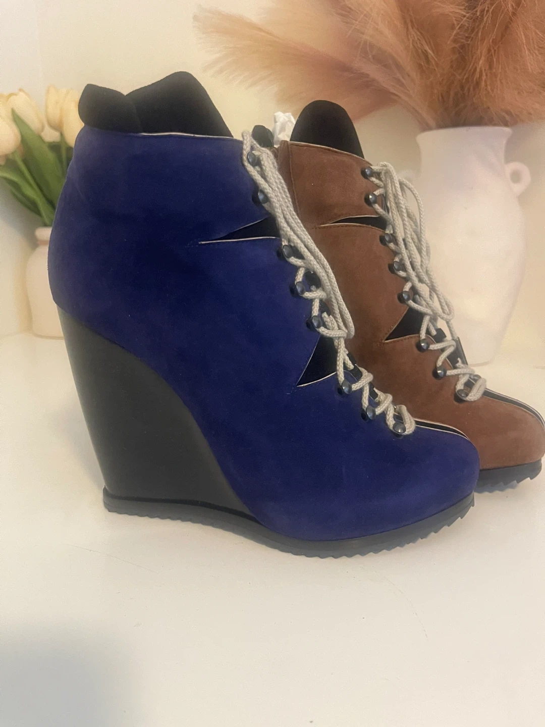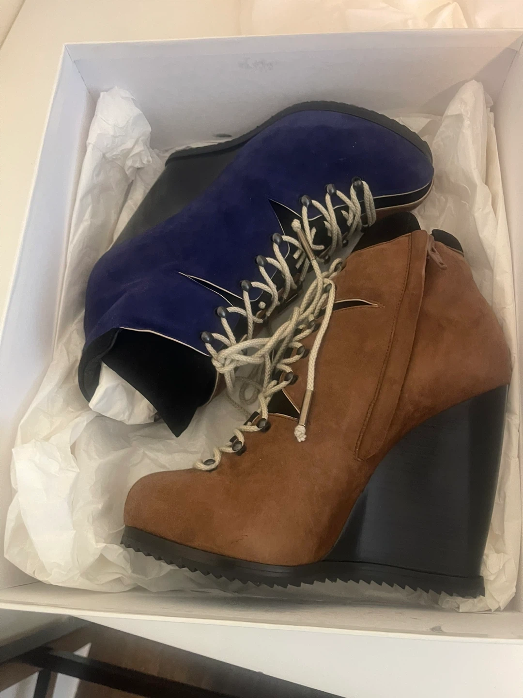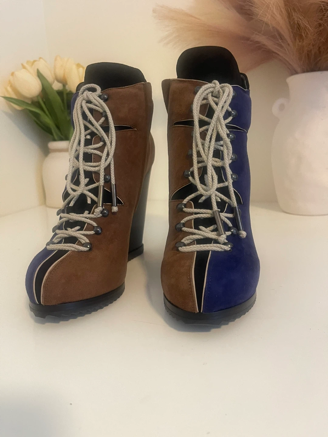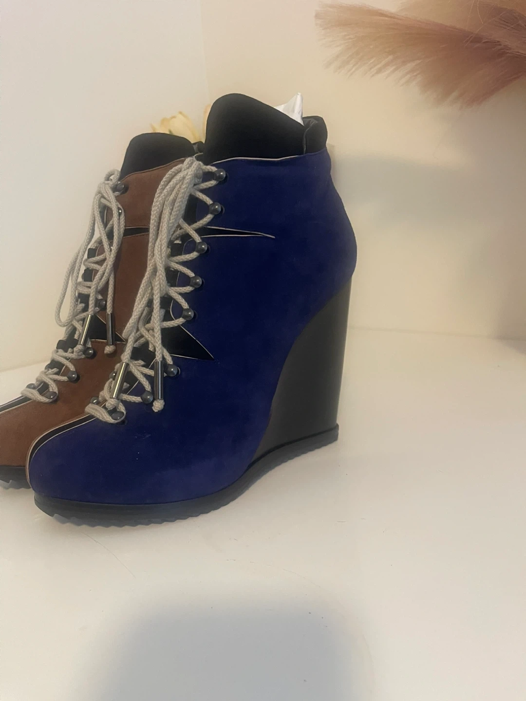 Stylish wedge ankle boots in a mix of blue and brown suede. Made in Italy. Size is 37.5. PIERRE HARDY