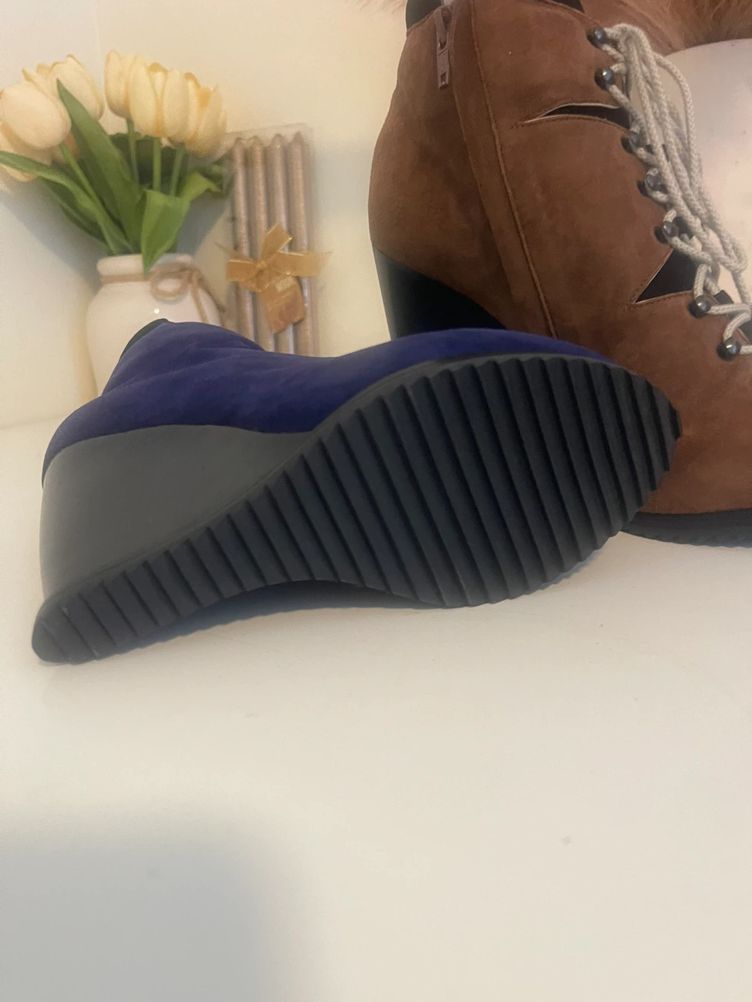 Stylish wedge ankle boots in a mix of blue and brown suede. Made in Italy. Size is 37.5. PIERRE HARDY