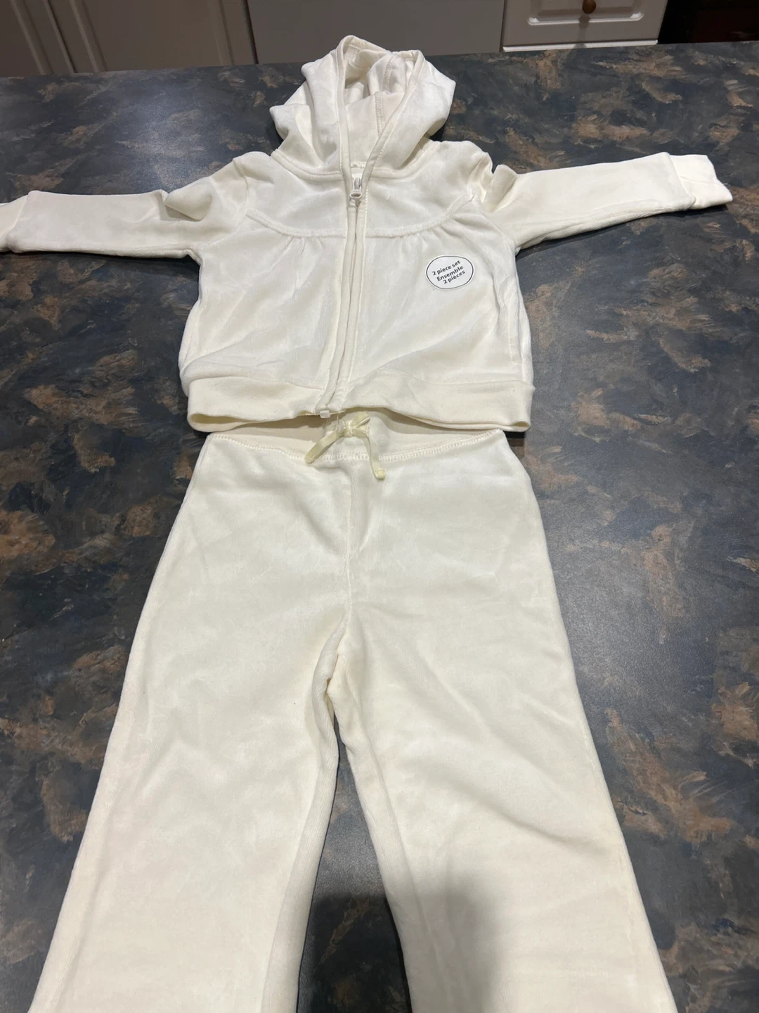 This cream velour tracksuit set includes a zip-up hoodie and matching pants. It's a cozy and comfortable outfit for little ones. The material is soft velour.