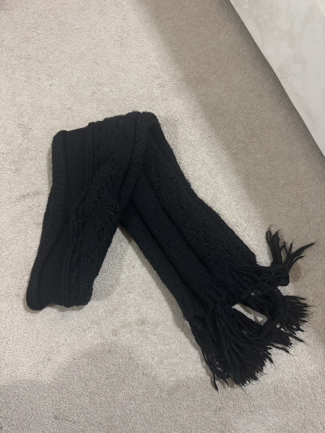 Cozy black knit scarf with a textured cable knit pattern. It has fringe detailing on both ends. Perfect for keeping warm on chilly days!