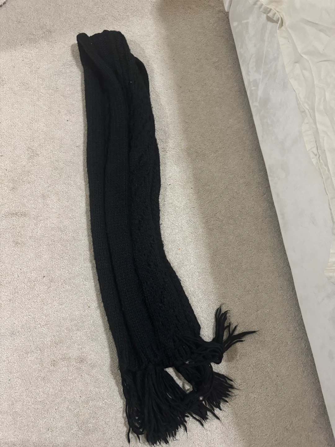Cozy black knit scarf with a textured cable knit pattern. It has fringe detailing on both ends. Perfect for keeping warm on chilly days!