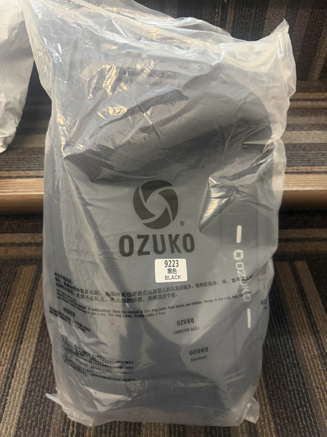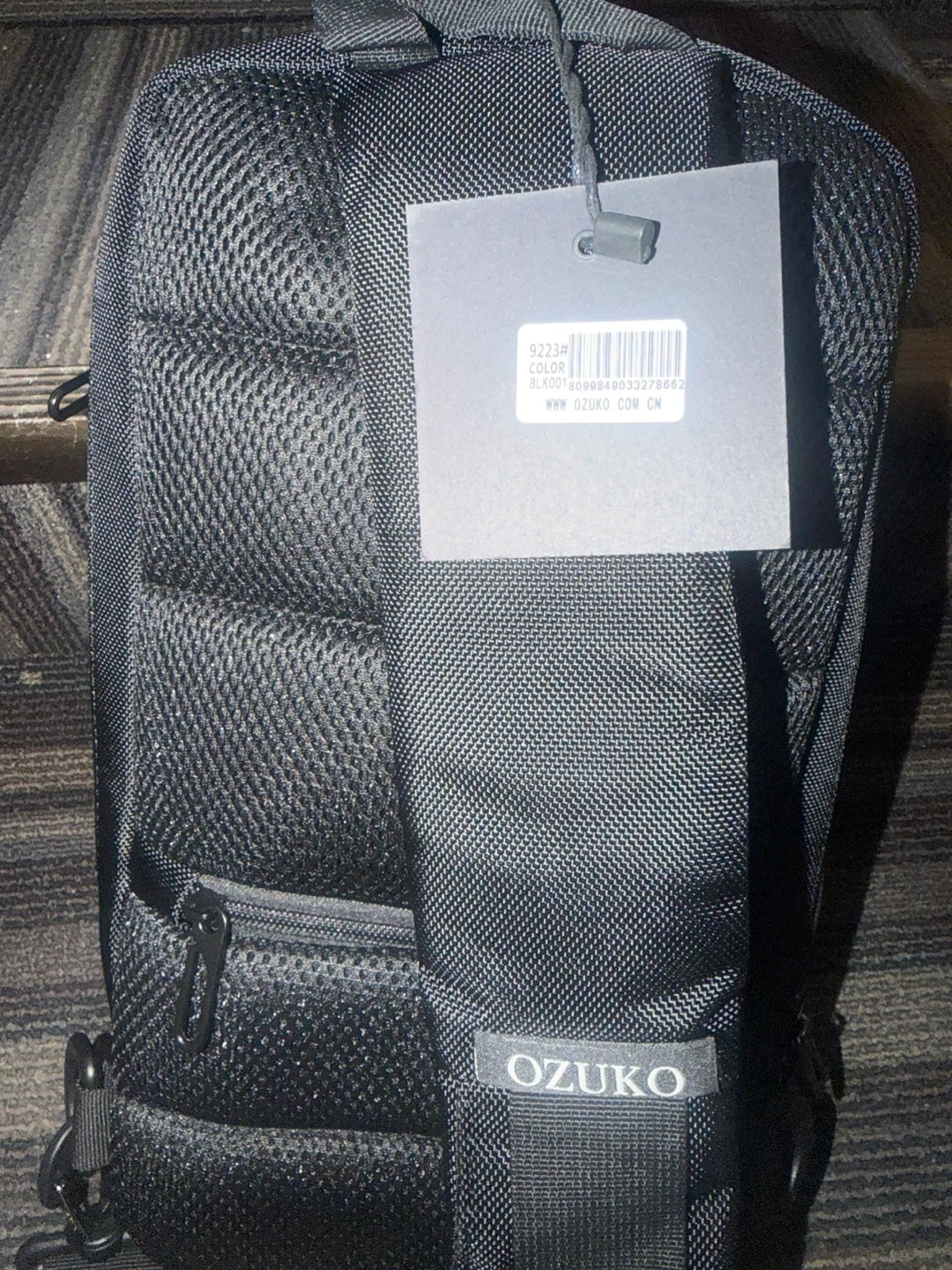 This is a black OZUKO computer bag backpack. It features a combination lock for added security. The interior has multiple compartments, and it's made of durable material. Perfect for carrying your laptop and essentials.
