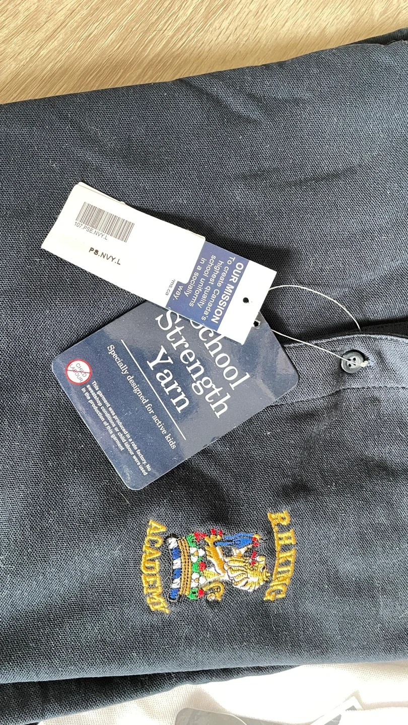 Two new white polo shirts and one navy polo shirt. Made with School Strength Yarn, specially designed for active kids. These shirts feature a RH King school crest. Bought before the uniform was voted out. It's great for school uniforms!