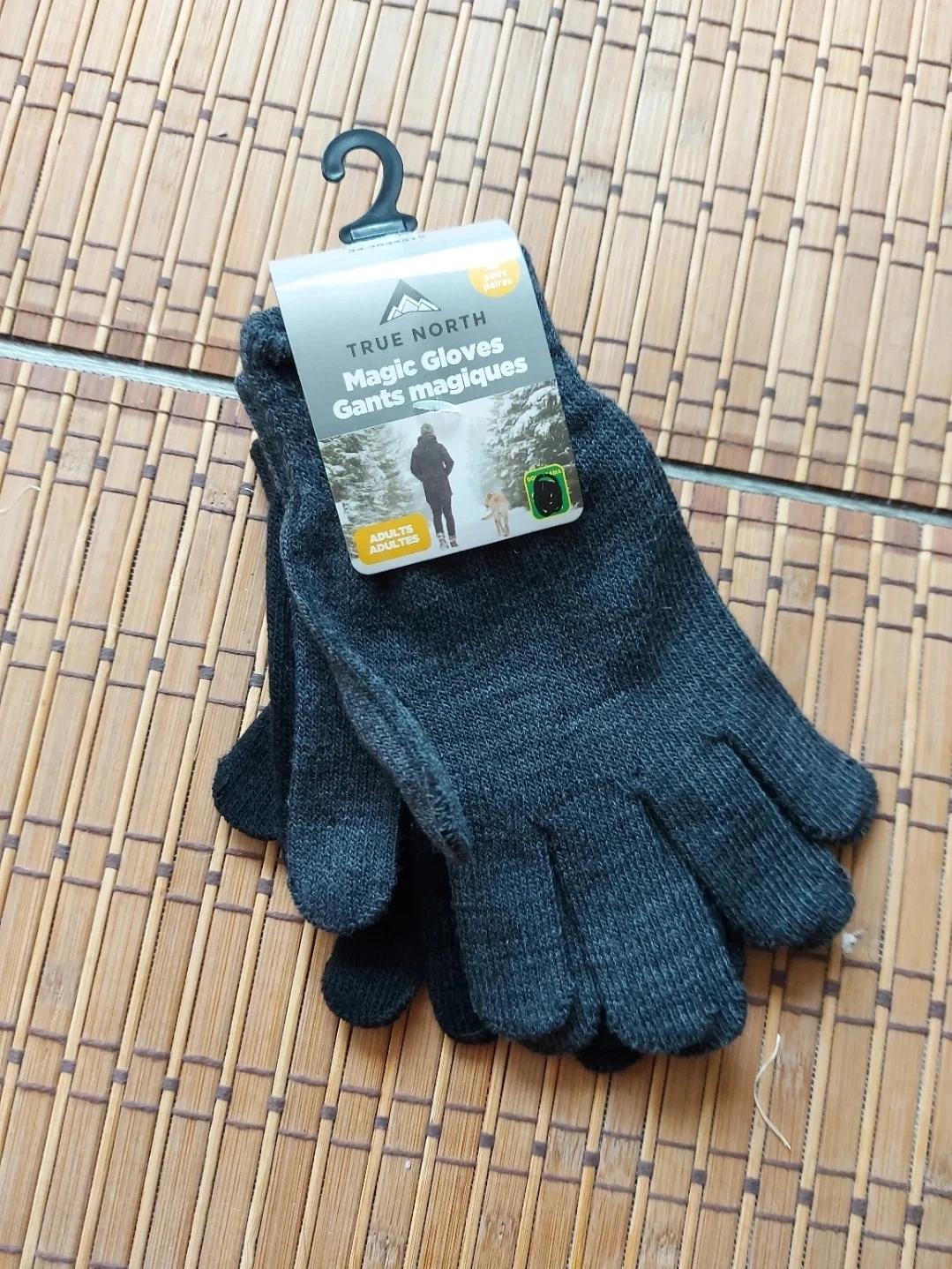These are True North magic gloves in a dark grey colour. They're designed for adults and are made of a knit material. Great for keeping your hands warm on colder days!