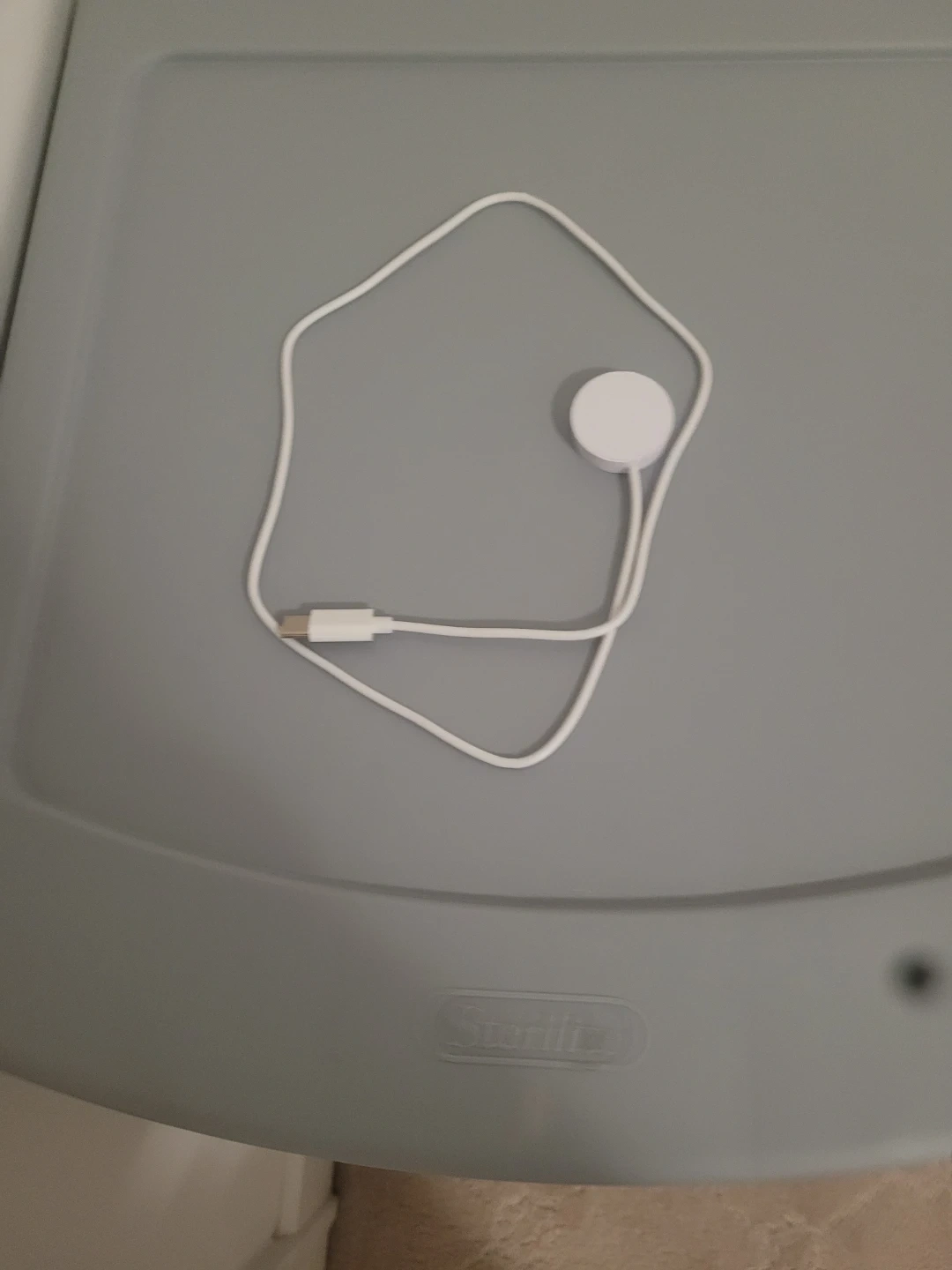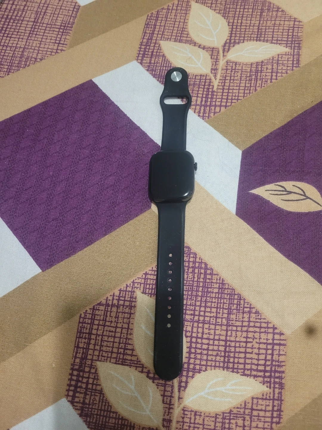 A black smartwatch with a silicone band. It comes with a wireless charging puck. Perfect for tracking fitness and staying connected on the go!