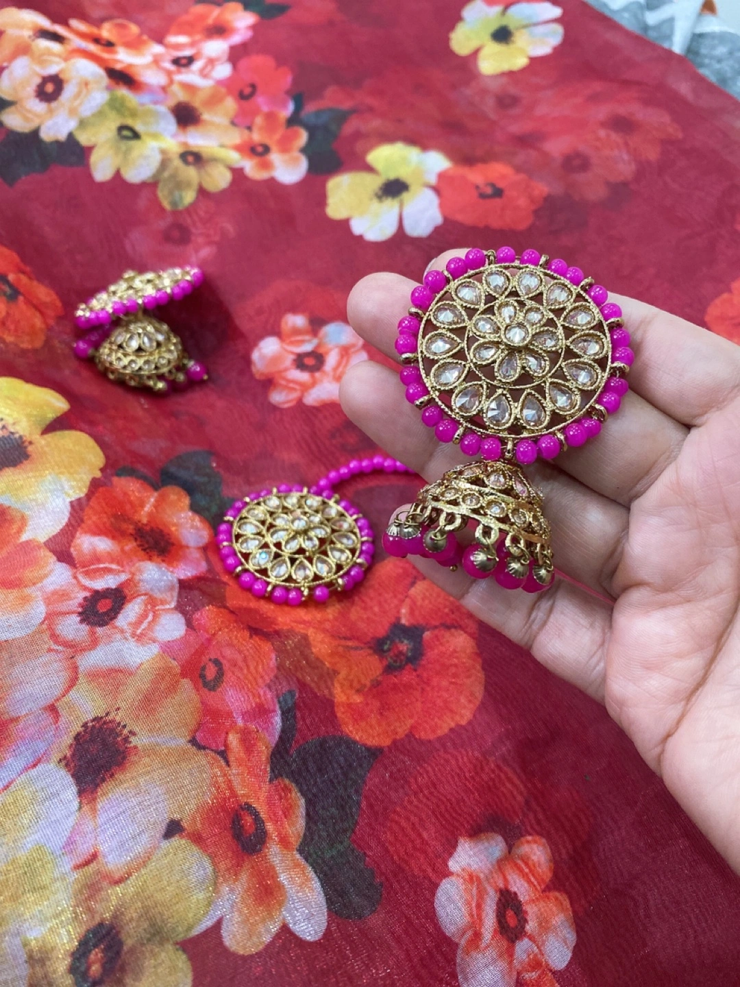 Beautiful Indian-style jhumka earrings with matching tikka set. The earrings are a lovely gold colour with pink bead accents. Perfect for adding a touch of elegance to any outfit!