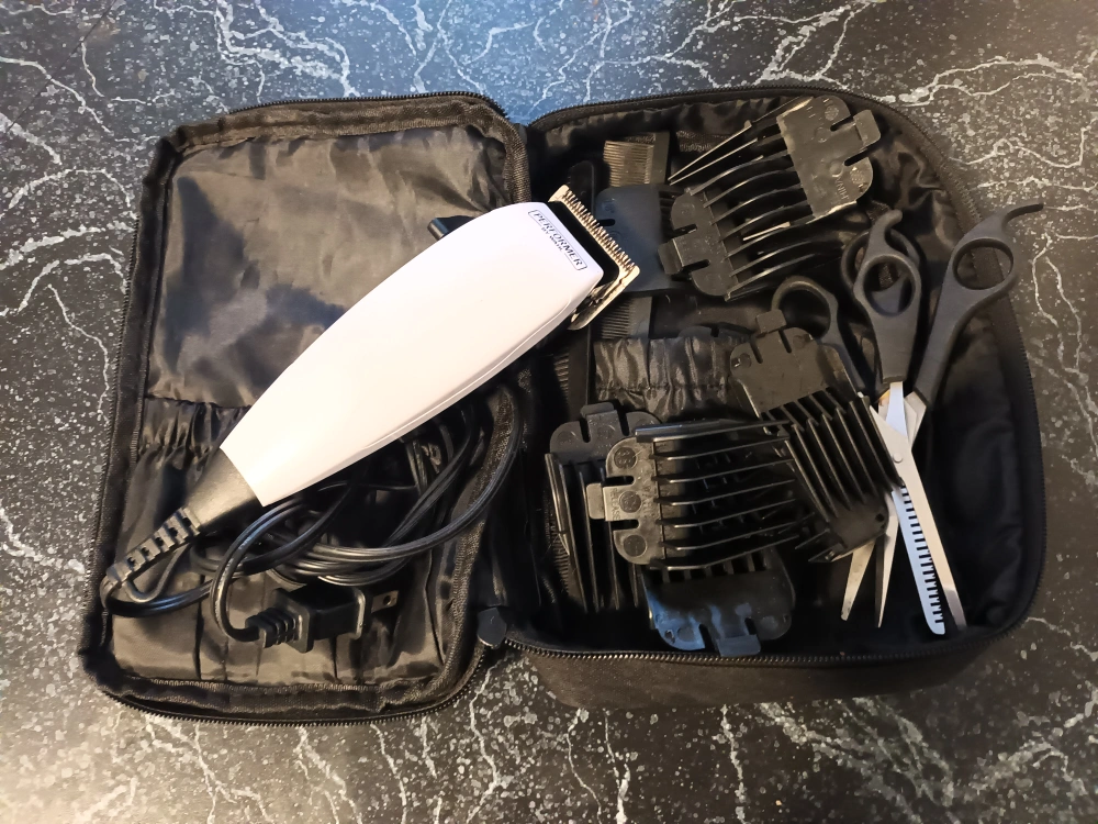 Complete hair clipper kit. Includes clipper, multiple guards, scissors, and carrying case. Great for home use