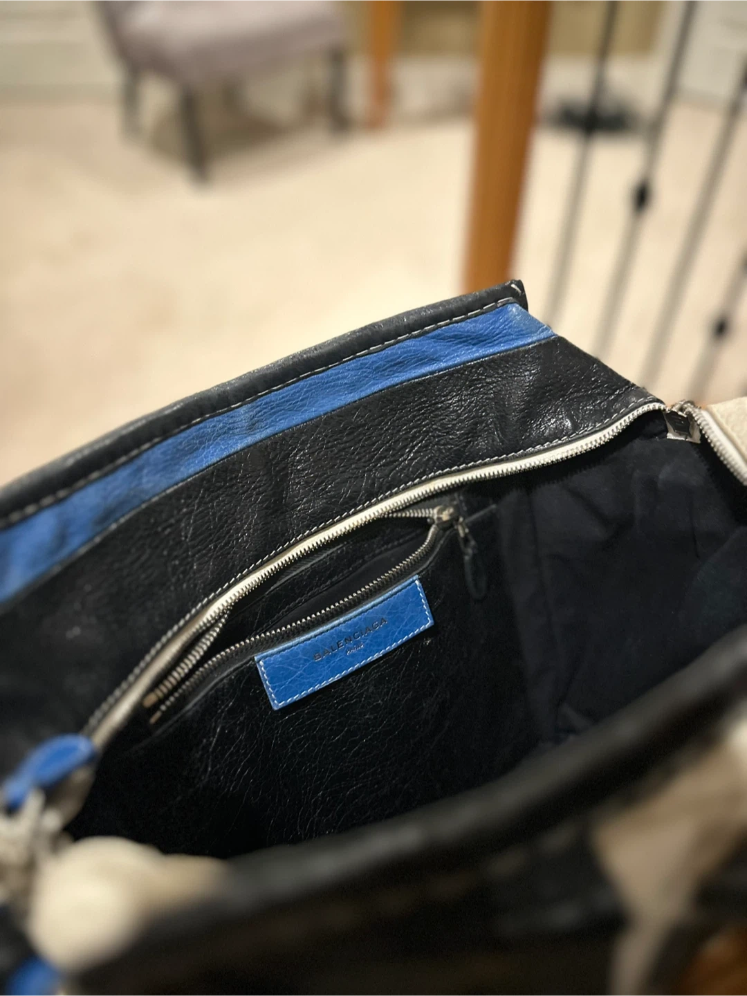 This is a Balenciaga Cabas tote bag. It features a striped design in black, white, and blue. It's a stylish and practical bag for everyday use