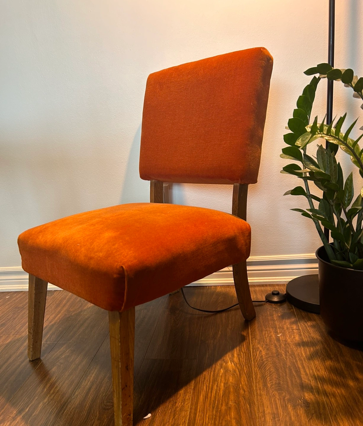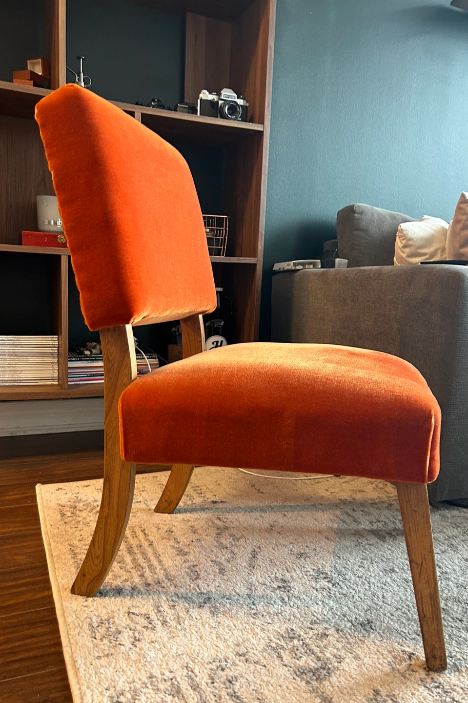 Vintage wooden accent chair with orange velvet textured upholstery. Has a retro/almost ncm vibe to it.