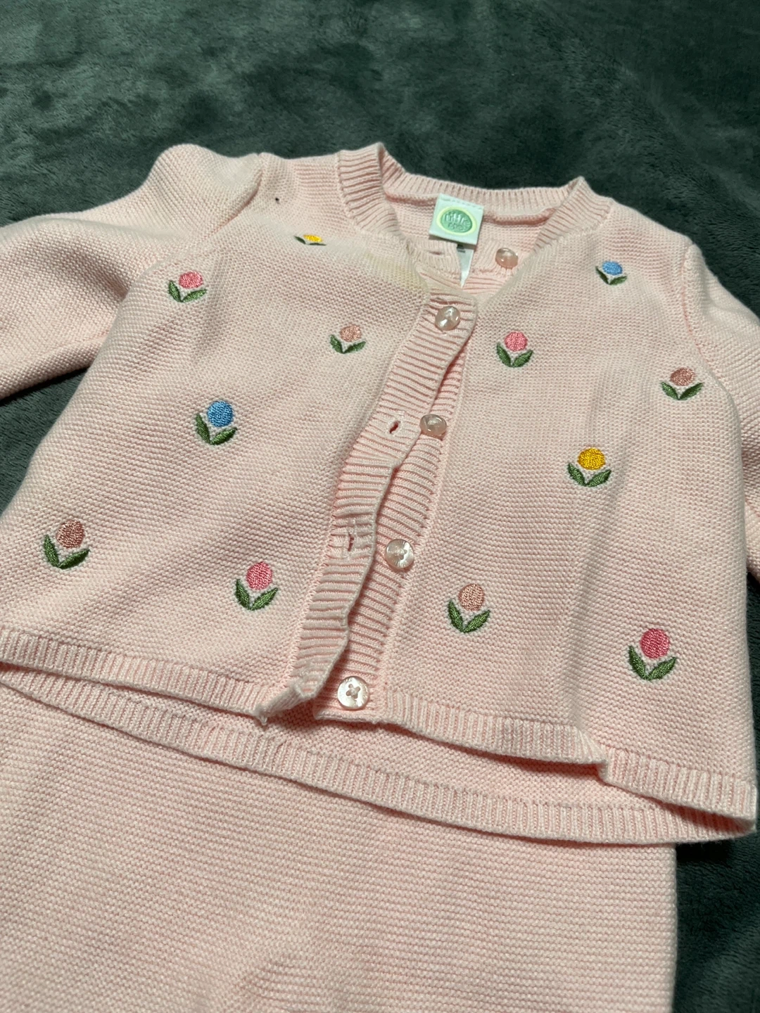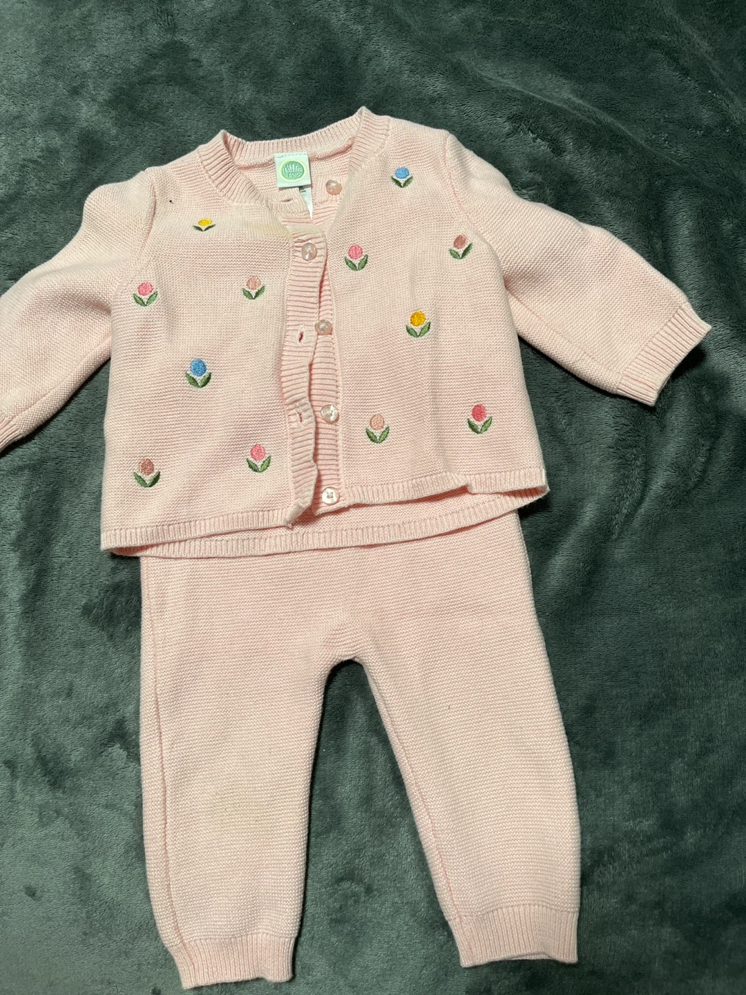 A cute Little Me knit outfit in size 6M! This adorable pink set features a cardigan and pants, both adorned with delicate floral embroidery. The material is soft and cozy, perfect for your little one. There are some stains on the cardigan.