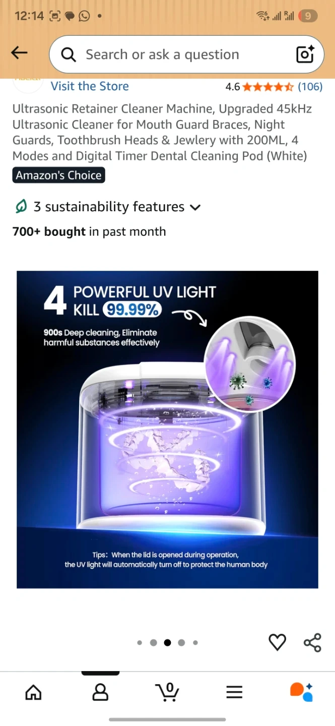 This ultrasonic cleaner uses 45kHz technology and UV light for deep cleaning. It holds up to 200ML and has 4 cleaning modes with a digital timer. It's great for retainers, mouth guards, toothbrush heads, and jewellery.