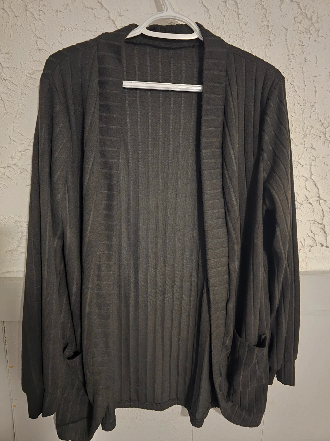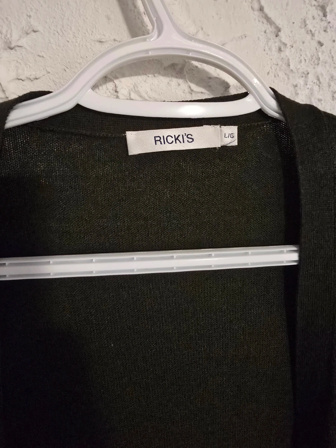 Knit cardigan Features a marbled burgundy colour and two front pockets. RICKI'S dark green knit cardigan. Both size Large and in excellent used condition. And a brand new black Xl cardigan. $5 each or all 3 for $10. Spb free home in Transcona.