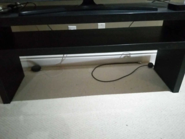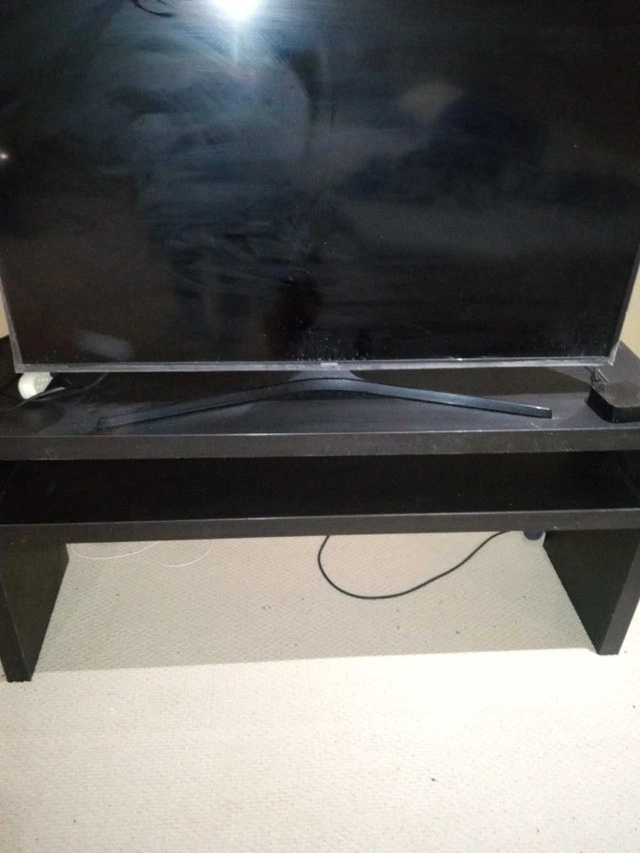 This is a used TV stand with two shelves. It's a sturdy piece of furniture that can hold a large TV and media devices. It has some minor cosmetic wear, as can be expected from a used item, but is in good functional condition. This versatile stand could be yours for only $40! If the ad is up, the item is available.
