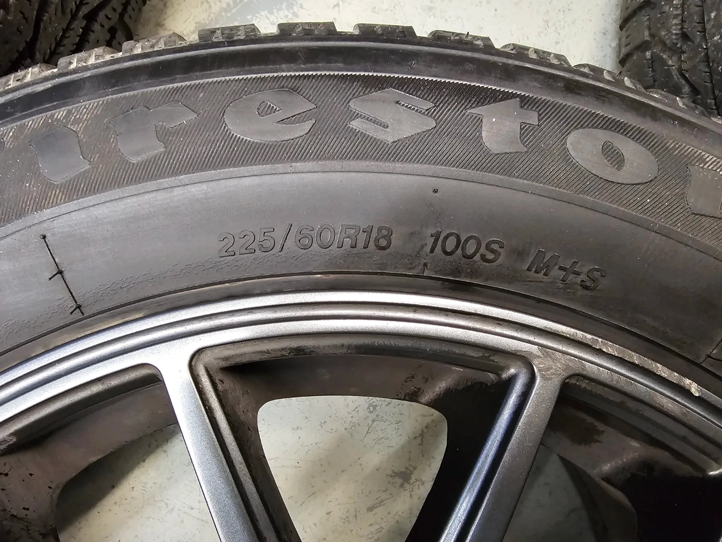 Set of 4 18" Firestone winter tires on alloy rims 225/60 R18 used on BMW X1/X3. Rims are replica and in good condition, no bend, no cracks, no damage. Tires have lots of thread left, tpms installed. Rims are multi-fit with bolt pattern 5×112 and 5×120