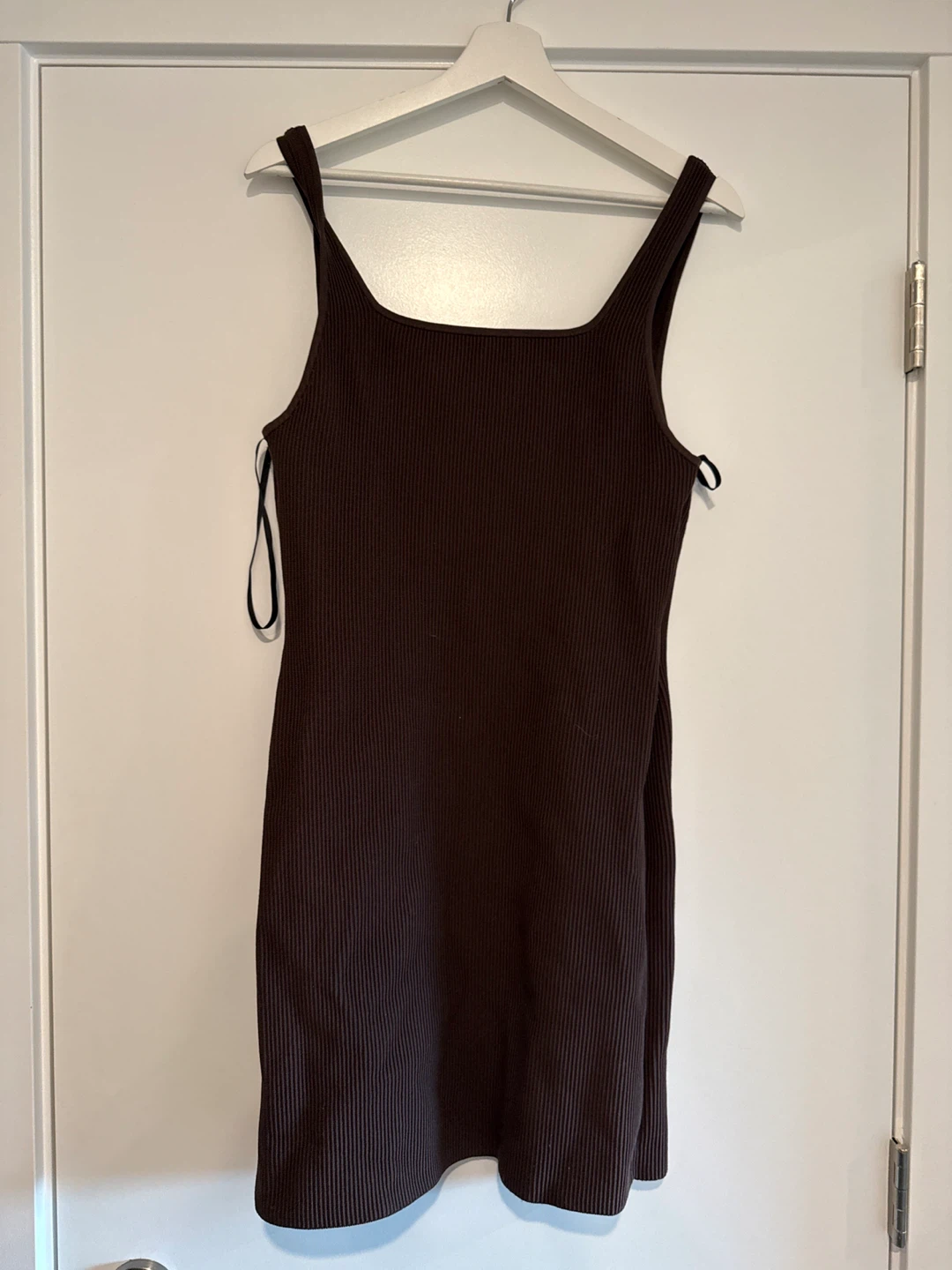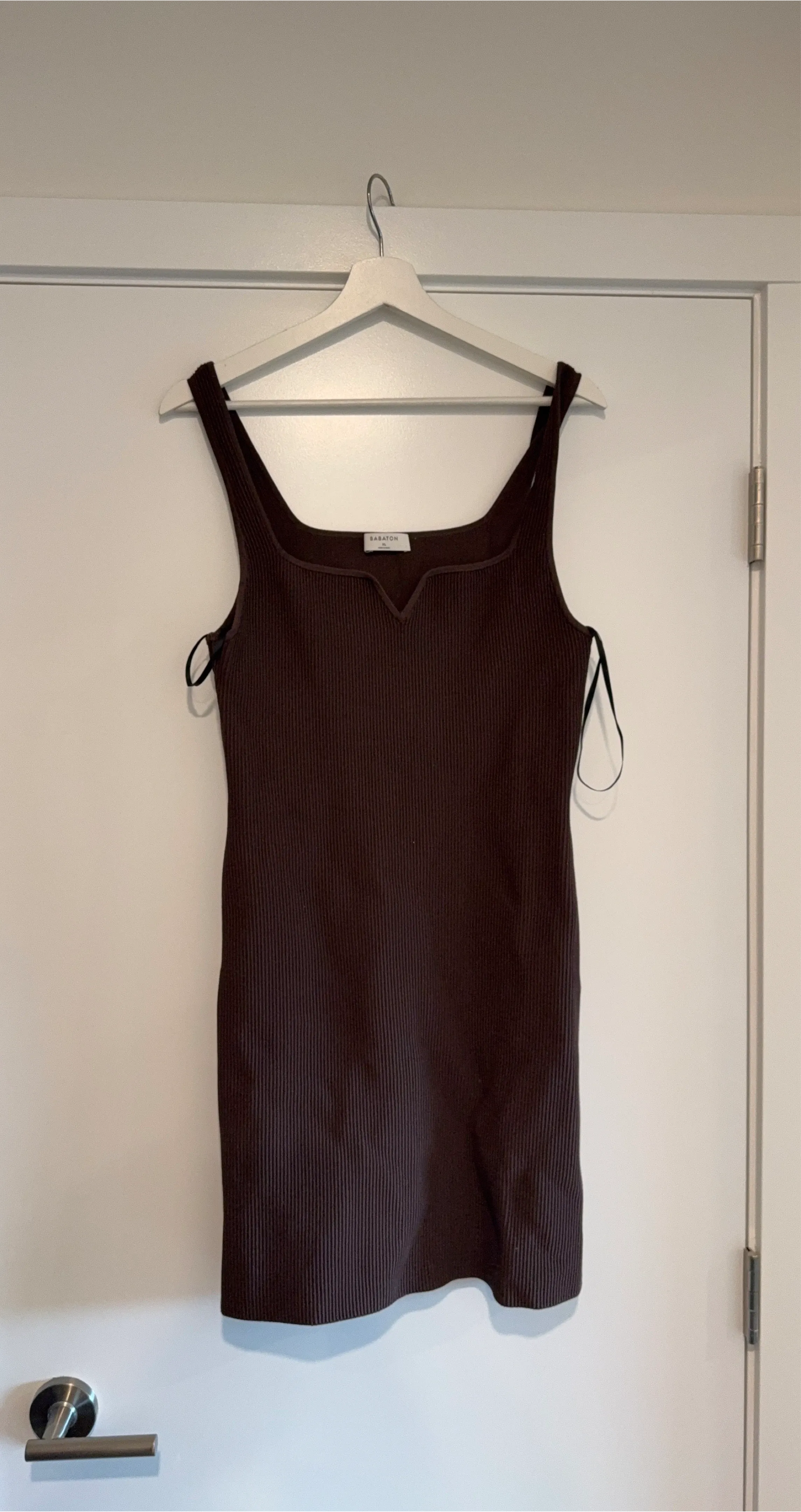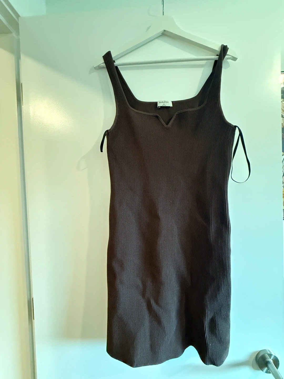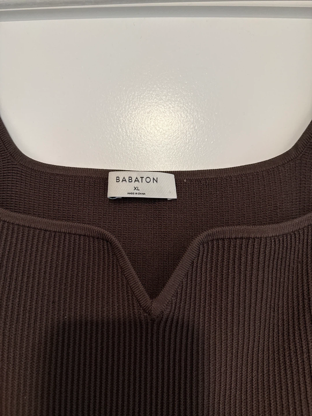This is a brown ribbed knit dress by Babaton. It's a size XL and made of a comfortable knit material. The square neckline and v-notch detail add a touch of style. It's perfect for layering or wearing on its own!